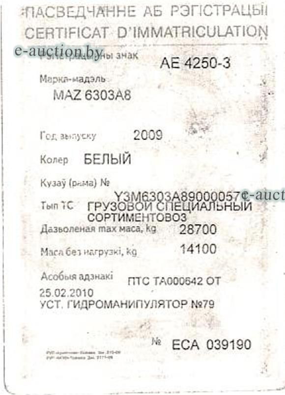 Рег. знак АЕ 4250-3 VIN: Y3M6303A890000571 Инвентарный №090230 Начальная стоимость с НДС. Покупатель самостоятельно или силами собственных специалистов, спецтехники (при необходимости) осуществляет самовывоз приобретенного имущества. |