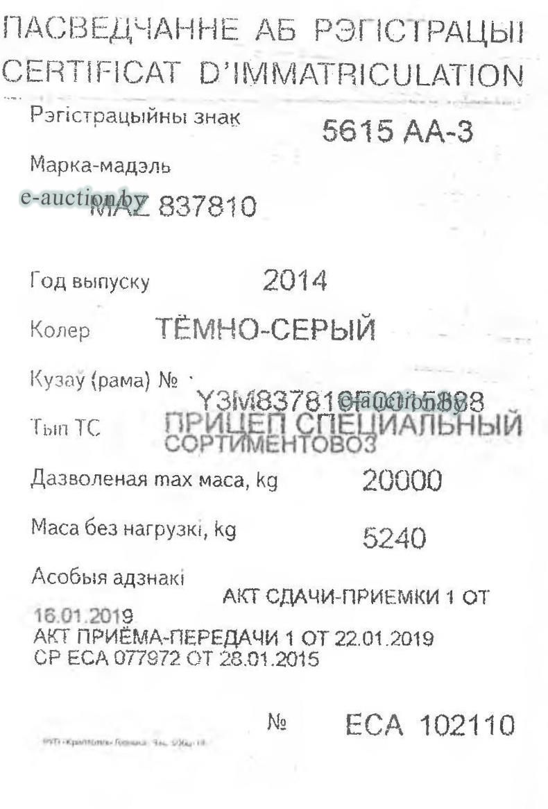 | Состояние | Рег. знак 5615 АА-3. VIN: Y3M837810F0015888. Инвентарный №061322. Начальная стоимость с НДС. Покупатель самостоятельно или силами собственных специалистов, спецтехники (при необходимости) осуществляет самовывоз приобретенного имущества. |