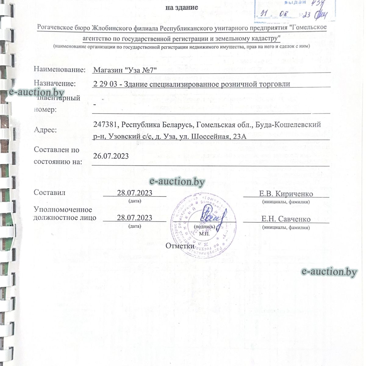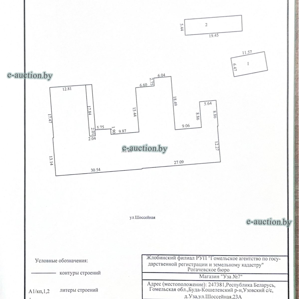 | Местоположение имущества | Гомельская область, Буда-Кошелевский р-н, д. Уза, ул. Шоссейная, 23А |