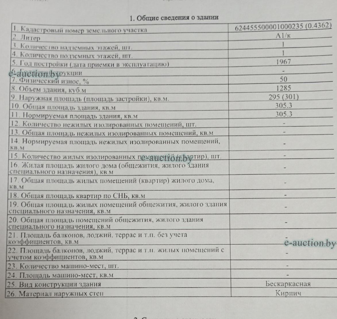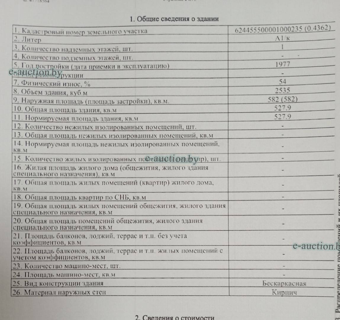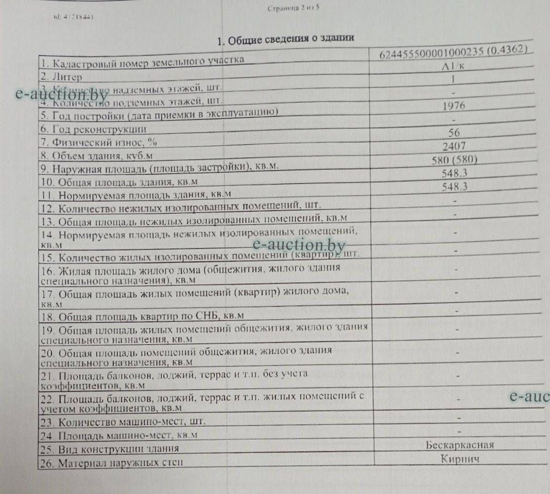 В состав и стоимость лота входит: Сведения о капитальном строении из ЕГРНИ: Инвентарный номер: 602/C-40382 Адрес (местоположение): Минская обл., Пуховичский р-н, г.п. Правдинский, ул. Зелёная, 67 Общая площадь (протяженность): 305.3 Наименование: Пилорама Назначение: Здание неустановленного назначения Составные части и принадлежности: А1/к-Пилорама,1-Пристройка,(А1/к)-Подвальный этаж,а-Ограждение Кадастровый номер земельного участка, на котором расположено капитальное строение: 624455500001000235. Отдельный земельный участок под обслуживание капитального строения не выделен. Право собственности (Собственность одного лица) Идентификационные сведения о правообладателе: Общество с ограниченной ответственностью "Паралимини-Групп", 193587297, 25.08.2021, УНП 193587297 Доля: 1/1 Сведения о капитальном строении из ЕГРНИ: Инвентарный номер: 602/C-40383 Адрес (местоположение): Минская обл., Пуховичский р-н, г.п. Правдинский, ул. Зелёная, 65 Общая площадь (протяженность): 527.9 Наименование: Столярный цех Назначение: Здание неустановленного назначения Составные части и принадлежности: А1/к-Столярный цех,1-Уборная Кадастровый номер земельного участка, на котором расположено капитальное строение: 624455500001000235. Отдельный земельный участок под обслуживание капитального строения не выделен. Право собственности (Собственность одного лица) Идентификационные сведения о правообладателе: Общество с ограниченной ответственностью "Паралимини-Групп", 193587297, 25.08.2021, УНП 193587297 Доля: 1/1 Сведения о капитальном строении из ЕГРНИ: Инвентарный номер: 602/C-40384 Адрес (местоположение): Минская обл., Пуховичский р-н, г.п. Правдинский, ул. Зелёная, 69 Общая площадь (протяженность): 548.3 Наименование: Складское помещение Назначение: Здание специализированное складов, торговых баз, баз материально-технического снабжения, хранилищ Составные части и принадлежности: А1/к-Складское помещение Кадастровый номер земельного участка, на котором расположено капитальное строение: 624455500001000235. Отдельный земельный участок под обслуживание капитального строения не выделен. Право собственности (Собственность одного лица) Идентификационные сведения о правообладателе: Общество с ограниченной ответственностью "Паралимини-Групп", 193587297, 25.08.2021, УНП 193587297 Доля: 1/1 Сведения о земельном участке из ЕГРНИ: Кадастровый номер: 624455500001000235 Адрес (местоположение): Минская обл., Пуховичский р-н, г.п. Правдинский, ул. Зелёная, 65 Площадь (га): 0.4362 Целевое назначение земельного участка: содержание и обслуживание производственной базы (складские помещения, столярный цех, здания пилорамы и сушилки) Назначение земельного участка в соответствии с единой классификацией назначения объектов недвижимого имущества: Земельный участок для размещения объектов неустановленного назначения Инвентарные номера капитальных строений: 602/C-40382, 602/C-40383, 602/C-40384 Право собственности (Собственность одного лица) Идентификационные сведения о правообладателе: Республика Беларусь Доля: 1/1 Право аренды Описание права, ограничения (обременения) прав: Право аренды Идентификационные сведения о правообладателе: Общество с ограниченной ответственностью "Паралимини-Групп", 193587297, 25.08.2021, УНП 193587297 Доля: 1/1 Срок действия: с 20.11.2023 по 02.11.2048 Стоимость указана с учетом НДС 20% |