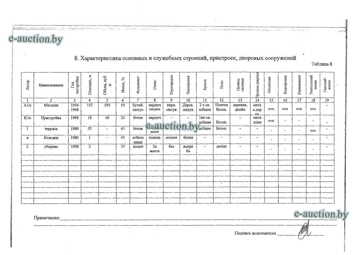 Сведения о капитальном строении: Инвентарный номер: 602/C-22110 Адрес (местоположение): Минская обл., Пуховичский р-н, д. Талька, ул. Центральная, 15А Общая площадь (протяженность): 137.2 Наименование: магазин Назначение: Здание специализированное розничной торговли Составные части и принадлежности: Одноэтажное кирпичное здание магазина с пристройкой, террасой-1, колодцем-а, уборной-2 Кадастровый номер земельного участка, на котором расположено капитальное строение: 624487600001000010 Право собственности (Собственность одного лица) Идентификационные сведения о правообладателе: Общество с ограниченной ответственностью "Паралимини-Групп", 193587297, 25.08.2021, УНП 193587297 Доля: 1/1 Сведения о земельном участке: Кадастровый номер: 624487600001000010 Адрес (местоположение): Минская обл., Пуховичский р-н, д. Талька Площадь (га): 0.1624 Целевое назначение земельного участка: содержание и обслуживание магазина Назначение земельного участка в соответствии с единой классификацией назначения объектов недвижимого имущества: Земельный участок для размещения объектов иного назначения Инвентарные номера капитальных строений: 602/C-22110 Право собственности (Собственность одного лица) Идентификационные сведения о правообладателе: Республика Беларусь Доля: 1/1 Право аренды Идентификационные сведения о правообладателе: Общество с ограниченной ответственностью "Паралимини-Групп", 193587297, 25.08.2021, УНП 193587297 Доля: 1/1 Цена указана с учетом НДС 20% |