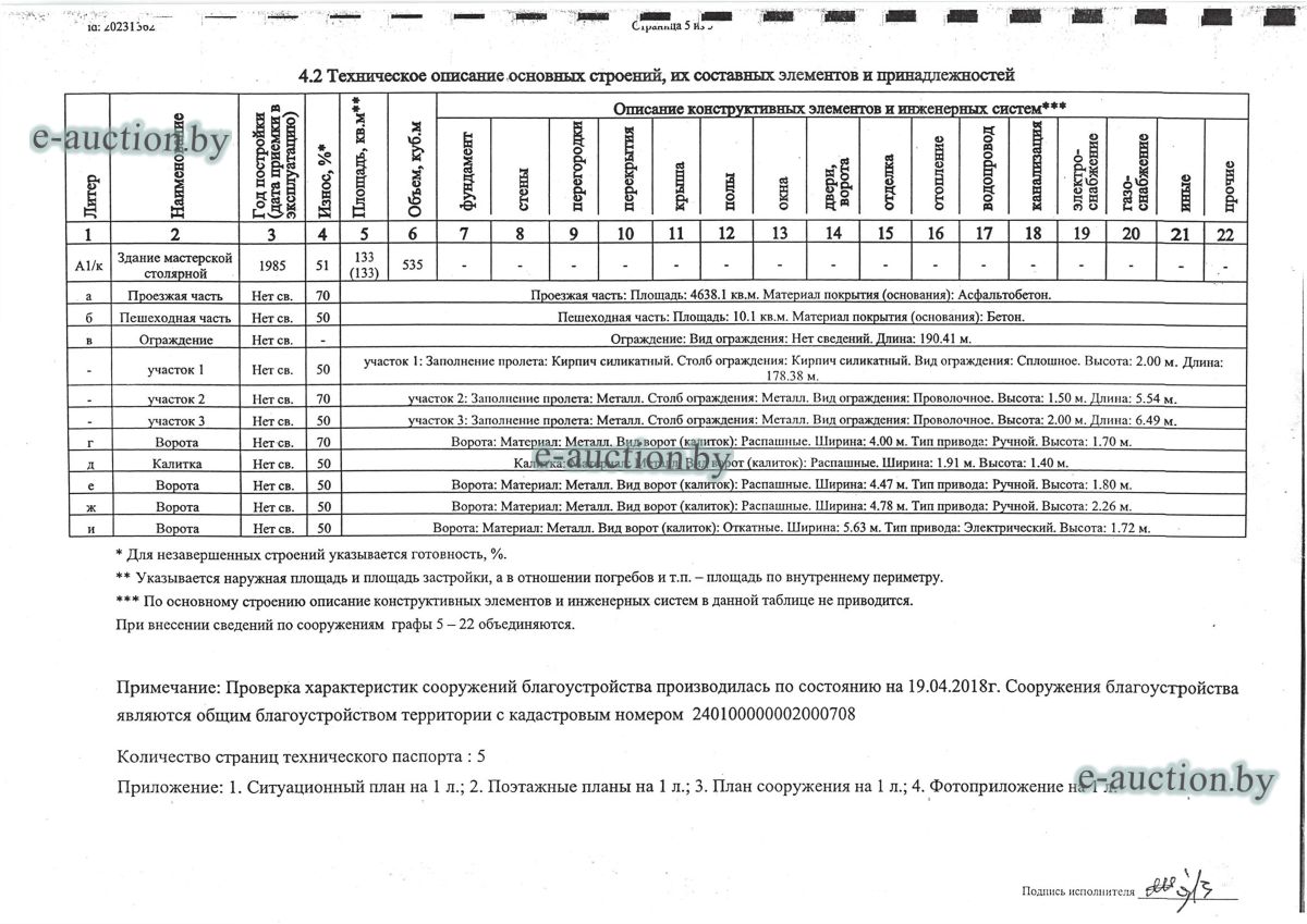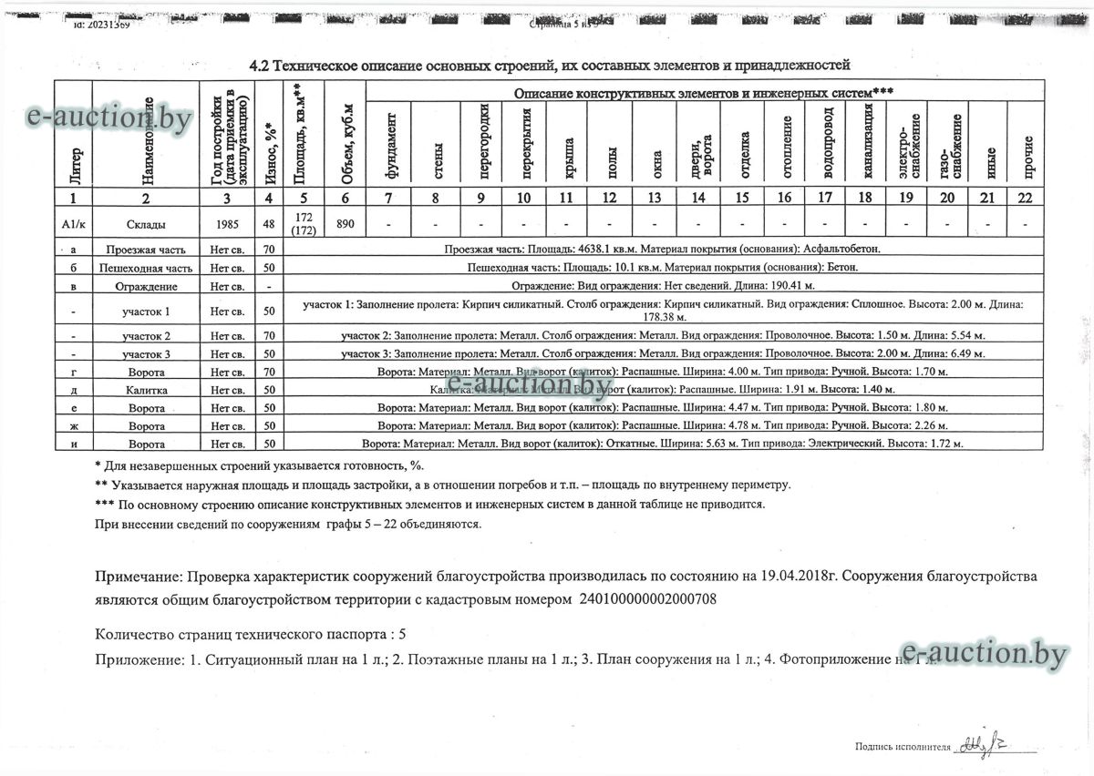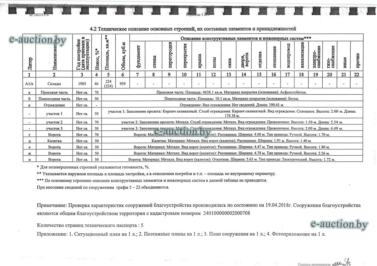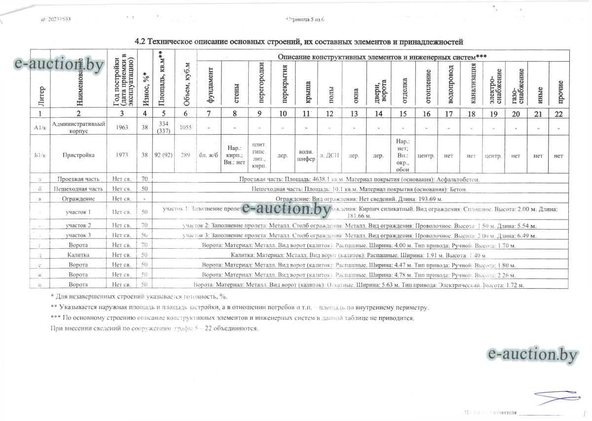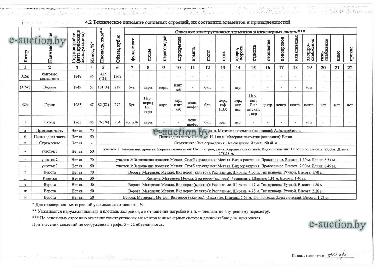 Комплекс недвижимого имущества с правом аренды земельного участка в г. Витебске и многолетним насаждением: 1. Сведения о капитальном строении: Инвентарный номер: 200/C-54443 Адрес (местоположение): Витебская обл., г. Витебск, ул. Октябрьская, 3 Общая площадь (протяженность): 322.6 Наименование: административный корпус Назначение: Здание административно-хозяйственное Составные части и принадлежности: пристройка, проезжая часть, пешеходная часть, ограждение: участок 1, участок 2, участок 3, четверо ворот, калитка 2. Сведения о капитальном строении: Инвентарный номер: 200/C-54455 Адрес (местоположение): Витебская обл., г. Витебск, ул. Октябрьская, 3/3 Общая площадь (протяженность): 714.6 Наименование: Столярная мастерская Назначение: Здание неустановленного назначения Составные части и принадлежности: Подвал, проезжая часть, пешеходная часть, ограждение: участок 1, участок 2, участок 3, калитка, четверо ворот Примечания: Кирпичное здание столярной мастерской 3. Сведения о капитальном строении: Инвентарный номер: 200/C-54444 Адрес (местоположение): Витебская обл., г. Витебск, ул. Октябрьская, 3/ 6 Общая площадь (протяженность): 259.4 Наименование: склады Назначение: Здание специализированное складов, торговых баз, баз материально-технического снабжения, хранилищ Составные части и принадлежности: щитовая, проезжая часть, пешеходная часть, ограждение: участок 1, участок 2, участок 3, четверо ворот, калитка Примечания: одноэтажное кирпичное здание складов с щитовой. 4. Сведения о капитальном строении: Инвентарный номер: 200/C-54441 Адрес (местоположение): Витебская обл., г. Витебск, ул. Октябрьская, 3/1 Общая площадь (протяженность): 173.2 Наименование: Склады Назначение: Здание специализированное складов, торговых баз, баз материально-технического снабжения, хранилищ Составные части и принадлежности: Пристройка, проезжая часть, пешеходная часть, ограждение: участок 1, участок 2, участок 3, калитка, четверо ворот Примечания: Одноэтажное кирпичное здание складов. 5. Сведения о капитальном строении: Инвентарный номер: 200/C-54446 Адрес (местоположение): Витебская обл., г. Витебск, ул. Октябрьская, 3/ 9 Общая площадь (протяженность): 94.1 Наименование: склад цементный Назначение: Здание специализированное складов, торговых баз, баз материально-технического снабжения, хранилищ Составные части и принадлежности: проезжая часть, пешеходная часть, ограждение: участок 1, участок 2, участок 3, четверо ворот, калитка Примечания: одноэтажное кирпичное здание цементного склада. 6. Сведения о капитальном строении: Инвентарный номер: 200/C-54447 Адрес (местоположение): Витебская обл., г. Витебск, ул. Октябрьская, 3/ 12 Общая площадь (протяженность): 336.4 Наименование: гаражи Назначение: Здание специализированное для ремонта и (или) технического обслуживания автомобилей (в том числе автомобильные заправочные, зарядные и газонаполнительные станции) Составные части и принадлежности: проезжая часть, пешеходная часть, ограждение: участок 1, участок 2, участок 3, четверо ворот, калитка Примечания: одноэтажное кирпичное здание гаражей. 7. Сведения о капитальном строении: Инвентарный номер: 200/C-54448 Адрес (местоположение): Витебская обл., г. Витебск, ул. Октябрьская, 3/ 2 Общая площадь (протяженность): 105.1 Наименование: здание мастерской столярной Назначение: Здание неустановленного назначения Составные части и принадлежности: проезжа