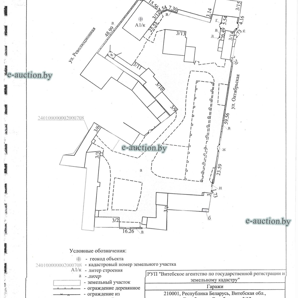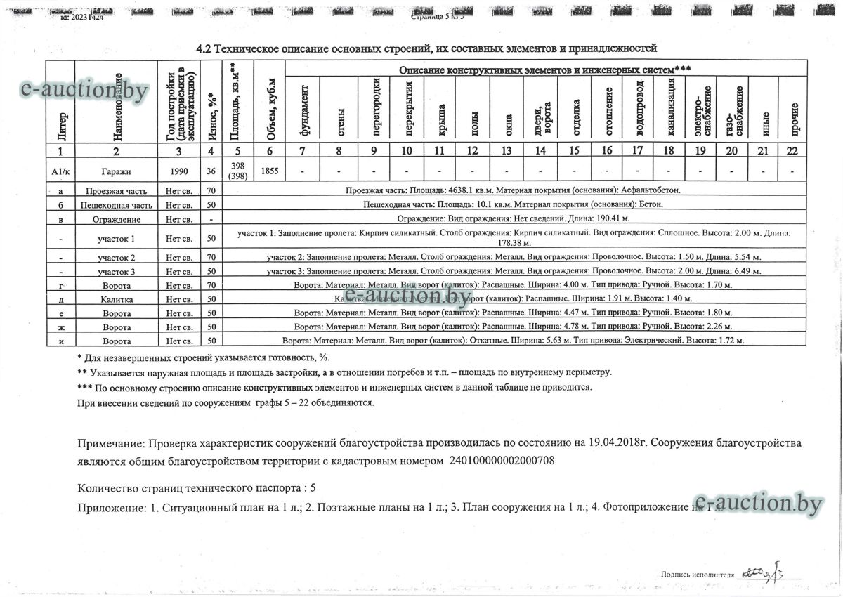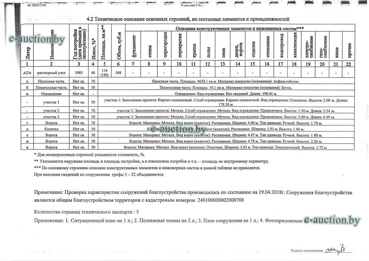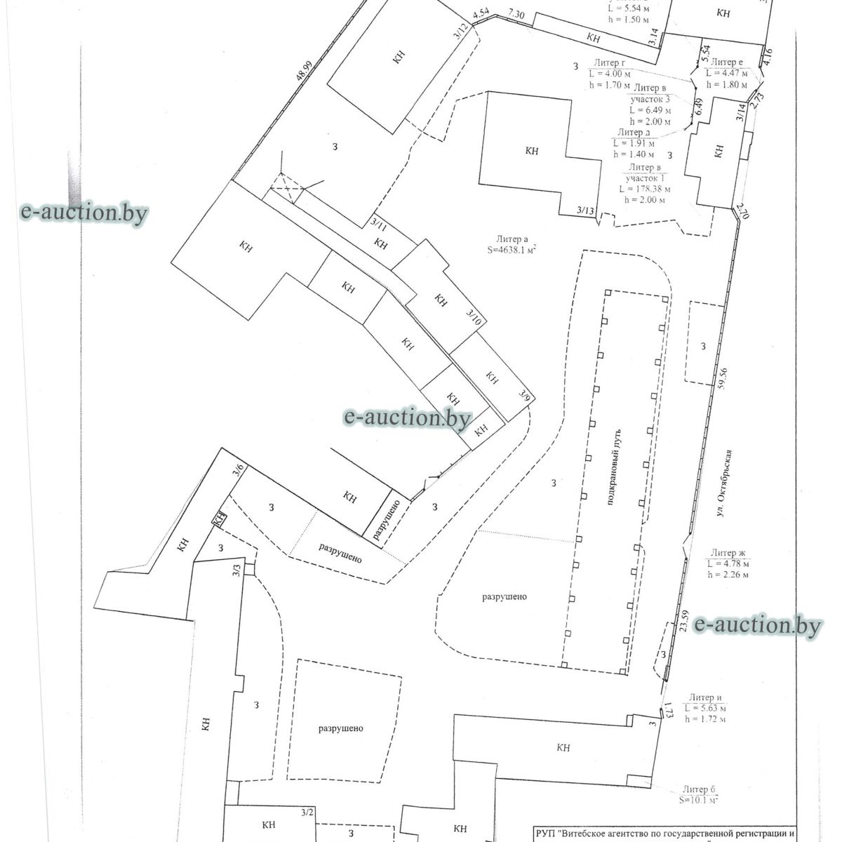Комплекс недвижимого имущества с правом аренды земельного участка в г. Витебске и многолетним насаждением: 1. Сведения о капитальном строении: Инвентарный номер: 200/C-54443 Адрес (местоположение): Витебская обл., г. Витебск, ул. Октябрьская, 3 Общая площадь (протяженность): 322.6 Наименование: административный корпус Назначение: Здание административно-хозяйственное Составные части и принадлежности: пристройка, проезжая часть, пешеходная часть, ограждение: участок 1, участок 2, участок 3, четверо ворот, калитка 2. Сведения о капитальном строении: Инвентарный номер: 200/C-54455 Адрес (местоположение): Витебская обл., г. Витебск, ул. Октябрьская, 3/3 Общая площадь (протяженность): 714.6 Наименование: Столярная мастерская Назначение: Здание неустановленного назначения Составные части и принадлежности: Подвал, проезжая часть, пешеходная часть, ограждение: участок 1, участок 2, участок 3, калитка, четверо ворот Примечания: Кирпичное здание столярной мастерской 3. Сведения о капитальном строении: Инвентарный номер: 200/C-54444 Адрес (местоположение): Витебская обл., г. Витебск, ул. Октябрьская, 3/ 6 Общая площадь (протяженность): 259.4 Наименование: склады Назначение: Здание специализированное складов, торговых баз, баз материально-технического снабжения, хранилищ Составные части и принадлежности: щитовая, проезжая часть, пешеходная часть, ограждение: участок 1, участок 2, участок 3, четверо ворот, калитка Примечания: одноэтажное кирпичное здание складов с щитовой. 4. Сведения о капитальном строении: Инвентарный номер: 200/C-54441 Адрес (местоположение): Витебская обл., г. Витебск, ул. Октябрьская, 3/1 Общая площадь (протяженность): 173.2 Наименование: Склады Назначение: Здание специализированное складов, торговых баз, баз материально-технического снабжения, хранилищ Составные части и принадлежности: Пристройка, проезжая часть, пешеходная часть, ограждение: участок 1, участок 2, участок 3, калитка, четверо ворот Примечания: Одноэтажное кирпичное здание складов. 5. Сведения о капитальном строении: Инвентарный номер: 200/C-54446 Адрес (местоположение): Витебская обл., г. Витебск, ул. Октябрьская, 3/ 9 Общая площадь (протяженность): 94.1 Наименование: склад цементный Назначение: Здание специализированное складов, торговых баз, баз материально-технического снабжения, хранилищ Составные части и принадлежности: проезжая часть, пешеходная часть, ограждение: участок 1, участок 2, участок 3, четверо ворот, калитка Примечания: одноэтажное кирпичное здание цементного склада. 6. Сведения о капитальном строении: Инвентарный номер: 200/C-54447 Адрес (местоположение): Витебская обл., г. Витебск, ул. Октябрьская, 3/ 12 Общая площадь (протяженность): 336.4 Наименование: гаражи Назначение: Здание специализированное для ремонта и (или) технического обслуживания автомобилей (в том числе автомобильные заправочные, зарядные и газонаполнительные станции) Составные части и принадлежности: проезжая часть, пешеходная часть, ограждение: участок 1, участок 2, участок 3, четверо ворот, калитка Примечания: одноэтажное кирпичное здание гаражей. 7. Сведения о капитальном строении: Инвентарный номер: 200/C-54448 Адрес (местоположение): Витебская обл., г. Витебск, ул. Октябрьская, 3/ 2 Общая площадь (протяженность): 105.1 Наименование: здание мастерской столярной Назначение: Здание неустановленного назначения Составные части и принадлежности: проезжа