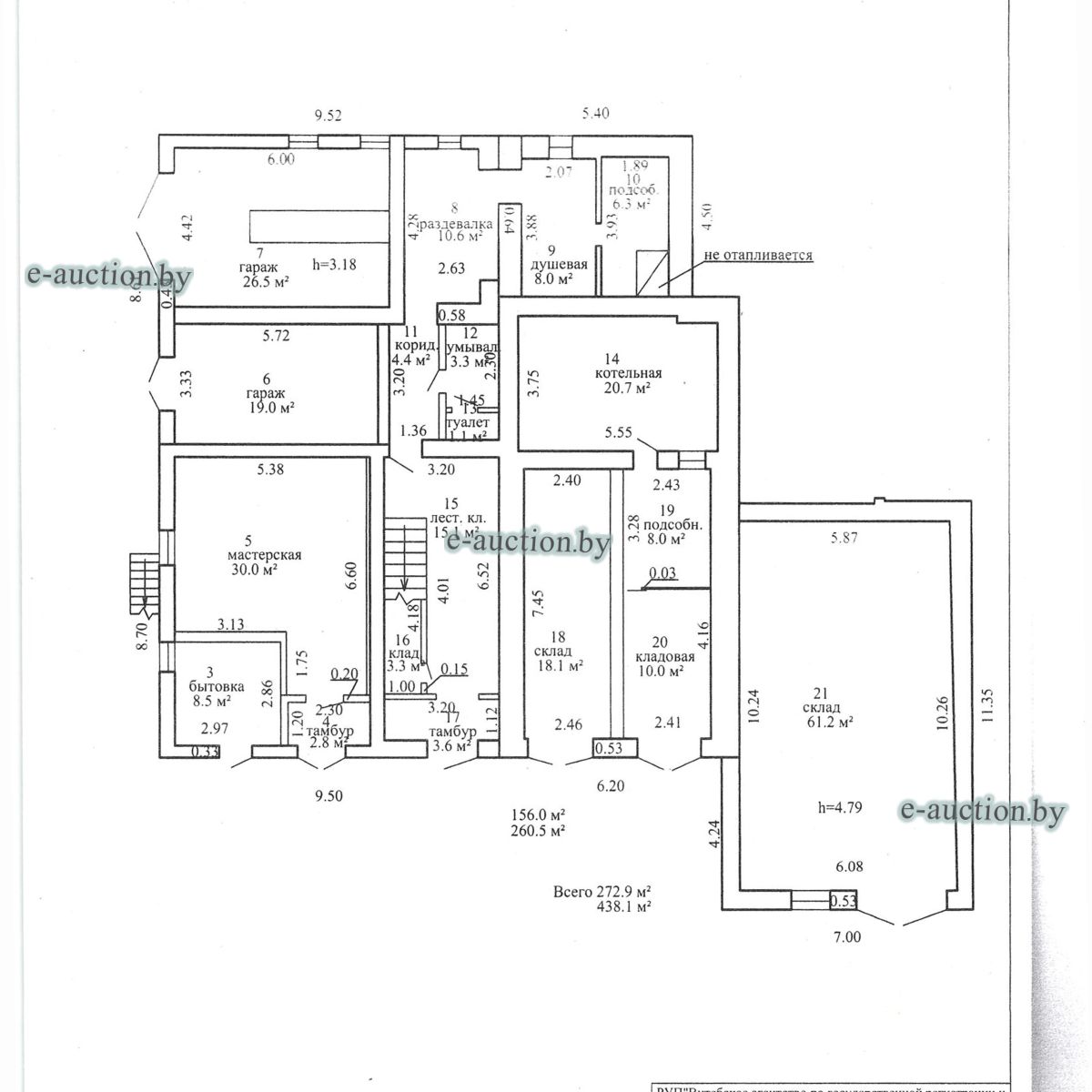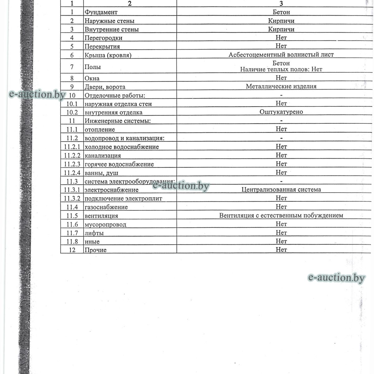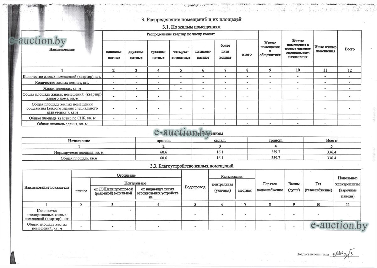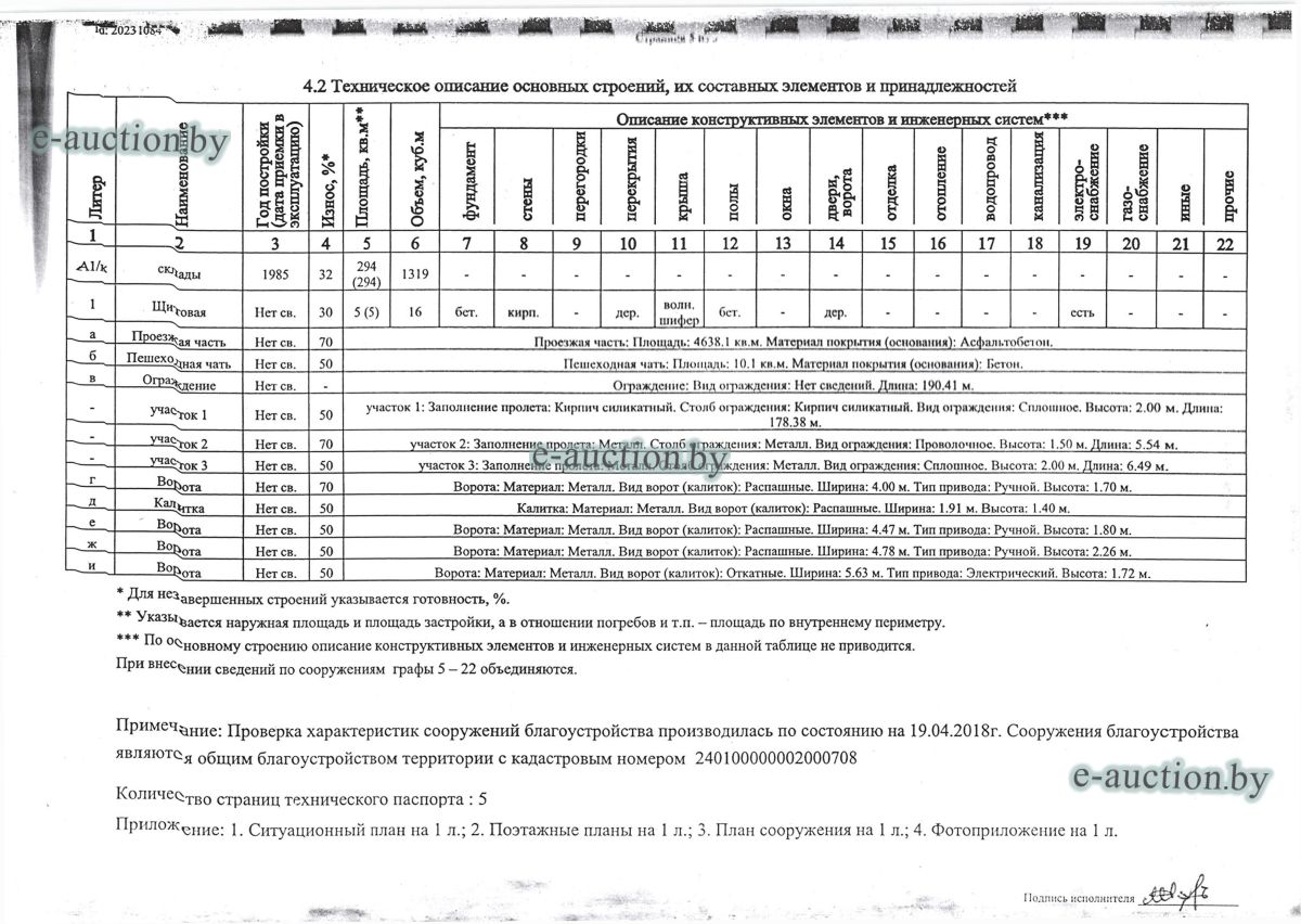 Комплекс недвижимого имущества с правом аренды земельного участка в г. Витебске и многолетним насаждением: 1. Сведения о капитальном строении: Инвентарный номер: 200/C-54443 Адрес (местоположение): Витебская обл., г. Витебск, ул. Октябрьская, 3 Общая площадь (протяженность): 322.6 Наименование: административный корпус Назначение: Здание административно-хозяйственное Составные части и принадлежности: пристройка, проезжая часть, пешеходная часть, ограждение: участок 1, участок 2, участок 3, четверо ворот, калитка 2. Сведения о капитальном строении: Инвентарный номер: 200/C-54455 Адрес (местоположение): Витебская обл., г. Витебск, ул. Октябрьская, 3/3 Общая площадь (протяженность): 714.6 Наименование: Столярная мастерская Назначение: Здание неустановленного назначения Составные части и принадлежности: Подвал, проезжая часть, пешеходная часть, ограждение: участок 1, участок 2, участок 3, калитка, четверо ворот Примечания: Кирпичное здание столярной мастерской 3. Сведения о капитальном строении: Инвентарный номер: 200/C-54444 Адрес (местоположение): Витебская обл., г. Витебск, ул. Октябрьская, 3/ 6 Общая площадь (протяженность): 259.4 Наименование: склады Назначение: Здание специализированное складов, торговых баз, баз материально-технического снабжения, хранилищ Составные части и принадлежности: щитовая, проезжая часть, пешеходная часть, ограждение: участок 1, участок 2, участок 3, четверо ворот, калитка Примечания: одноэтажное кирпичное здание складов с щитовой. 4. Сведения о капитальном строении: Инвентарный номер: 200/C-54441 Адрес (местоположение): Витебская обл., г. Витебск, ул. Октябрьская, 3/1 Общая площадь (протяженность): 173.2 Наименование: Склады Назначение: Здание специализированное складов, торговых баз, баз материально-технического снабжения, хранилищ Составные части и принадлежности: Пристройка, проезжая часть, пешеходная часть, ограждение: участок 1, участок 2, участок 3, калитка, четверо ворот Примечания: Одноэтажное кирпичное здание складов. 5. Сведения о капитальном строении: Инвентарный номер: 200/C-54446 Адрес (местоположение): Витебская обл., г. Витебск, ул. Октябрьская, 3/ 9 Общая площадь (протяженность): 94.1 Наименование: склад цементный Назначение: Здание специализированное складов, торговых баз, баз материально-технического снабжения, хранилищ Составные части и принадлежности: проезжая часть, пешеходная часть, ограждение: участок 1, участок 2, участок 3, четверо ворот, калитка Примечания: одноэтажное кирпичное здание цементного склада. 6. Сведения о капитальном строении: Инвентарный номер: 200/C-54447 Адрес (местоположение): Витебская обл., г. Витебск, ул. Октябрьская, 3/ 12 Общая площадь (протяженность): 336.4 Наименование: гаражи Назначение: Здание специализированное для ремонта и (или) технического обслуживания автомобилей (в том числе автомобильные заправочные, зарядные и газонаполнительные станции) Составные части и принадлежности: проезжая часть, пешеходная часть, ограждение: участок 1, участок 2, участок 3, четверо ворот, калитка Примечания: одноэтажное кирпичное здание гаражей. 7. Сведения о капитальном строении: Инвентарный номер: 200/C-54448 Адрес (местоположение): Витебская обл., г. Витебск, ул. Октябрьская, 3/ 2 Общая площадь (протяженность): 105.1 Наименование: здание мастерской столярной Назначение: Здание неустановленного назначения Составные части и принадлежности: проезжа
