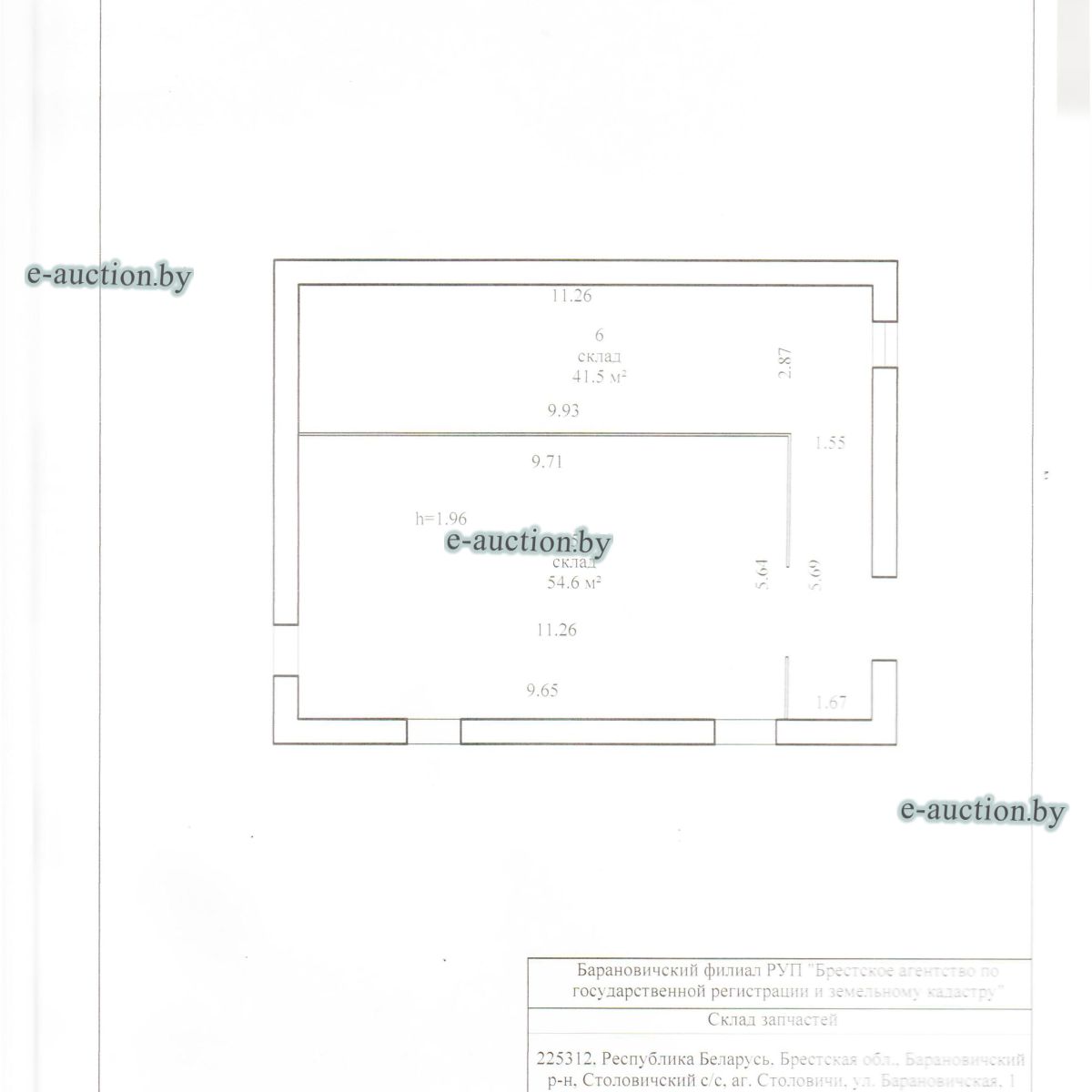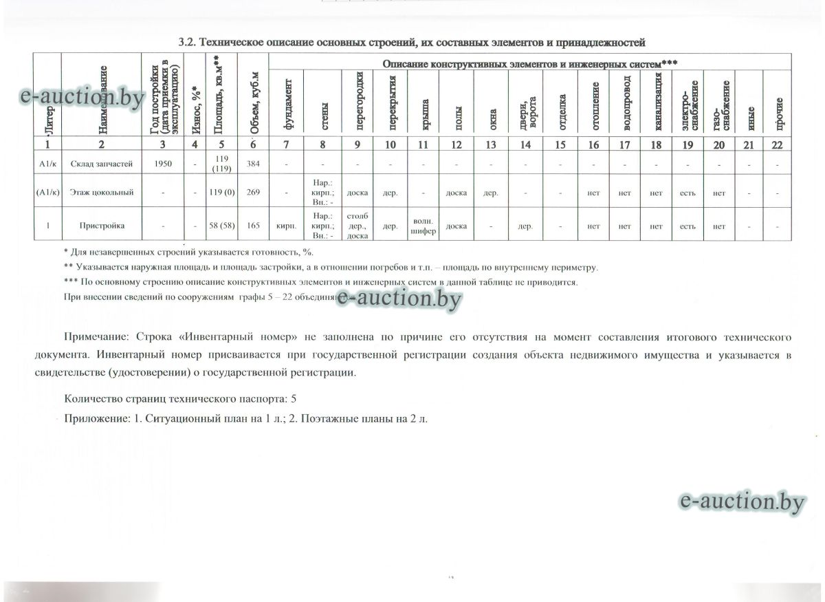 Сведения о капитальном строении из ЕГРНИ: Инвентарный номер: 110/C-124657 Адрес (местоположение): Брестская обл., Барановичский р-н, Столовичский с/с, аг. Столовичи, ул. Барановичская, 1 Общая площадь (протяженность): 243.1 Наименование: Склад запчастей Назначение: Здание специализированное складов, торговых баз, баз материально-технического снабжения, хранилищ Составные части и принадлежности: Этаж цокольный, пристройка. Право собственности: Открытое акционерное общество "СтоловичиАгро". Расположено на земельном участке с кад. №120489004101000554 площадью 0.0341 га (Право постоянного пользования). Цена указана с НДС. |
