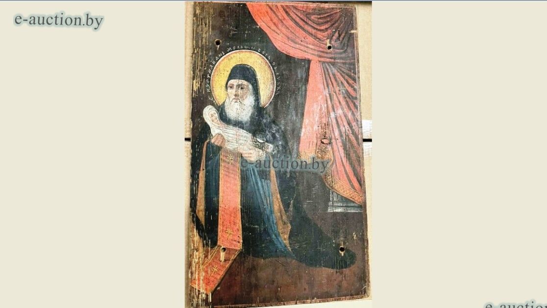 XIX — начало ХХ в. Дерево, масло; размер 52,8 х 30 см. Сохранность: доска цельная, вертикальная, хвойной породы. Шпонки врезные, сквозные, встречные. Общее поверхностное загрязнение. Основа повреждена жуком-точильщиком. Левая часть основы утрачена, разлом по склейке досок. Имеется четыре сквозных отверстия вдоль шпонок попарно. Красочный слой без грунта, умеренно повреждён. Мелкие утраты красочного слоя, в большей степени — у левого края. |