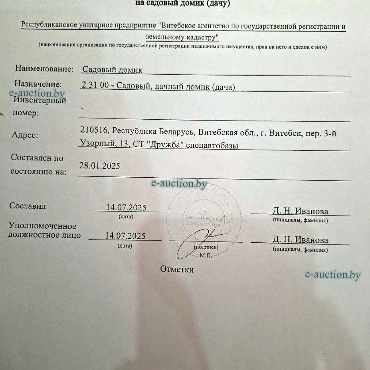| Местоположение имущества | г. Витебск, пер. 3-й Узорный, 13, СТ "Дружба" спецавтобазы |