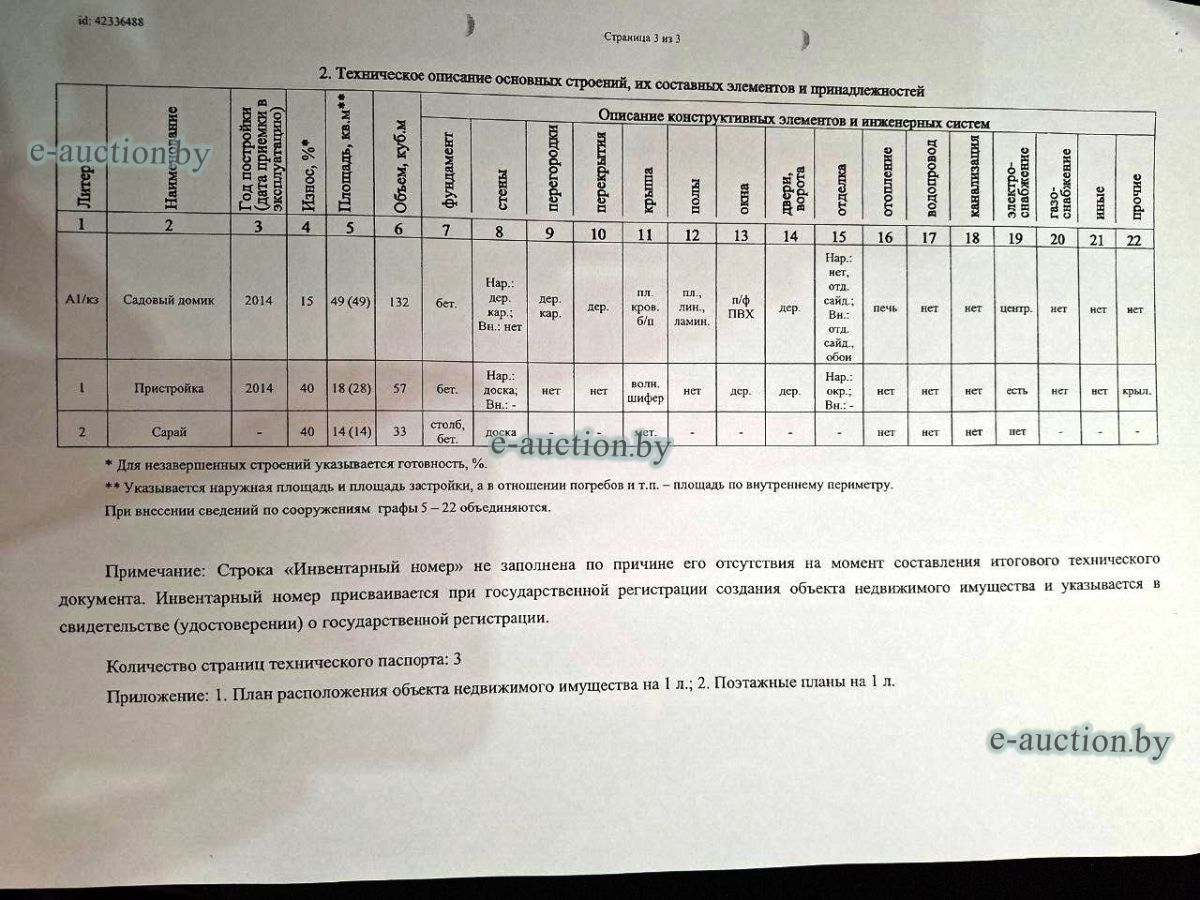 Сведения о капитальном строении из ЕГРНИ: Наименование: садовый домик; Назначение: садовый, дачный домик (дача); Составные части и принадлежности: 1-Пристройка, 2-Сарай. Общая долевая собственность. Расположено на земельном участке с кад. № 240100000019000191 площадью 0.0618 га (право пожизненного наследуемого владения). Целевое назначение земельного участка: земельный участок для коллективного садоводства. Назначение земельного участка в соответствии с единой классификацией назначения объектов недвижимого имущества: земельный участок для коллективного садоводства. Обращаем ваше внимание: в соответствии с положением о садоводческих товариществах, утверждённым Указом Президента Республики Беларусь № 155 от 30.05.2023, членами товарищества могут быть граждане Республики Беларусь, иностранные граждане и лица без гражданства, имеющие в границах товарищества на праве частной собственности, пожизненного наследуемого владения или аренды земельные участки (доли в праве на них), предоставленные для коллективного садоводства. |