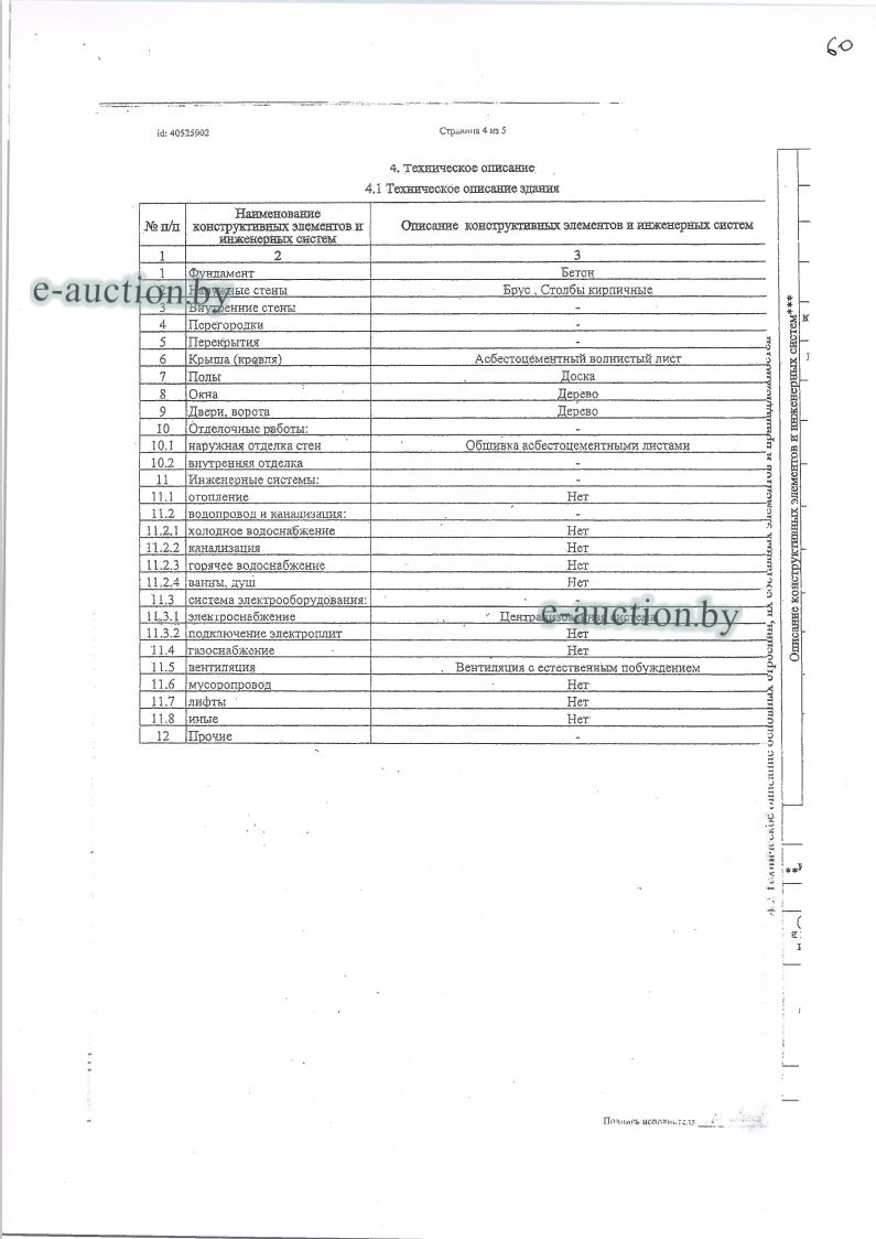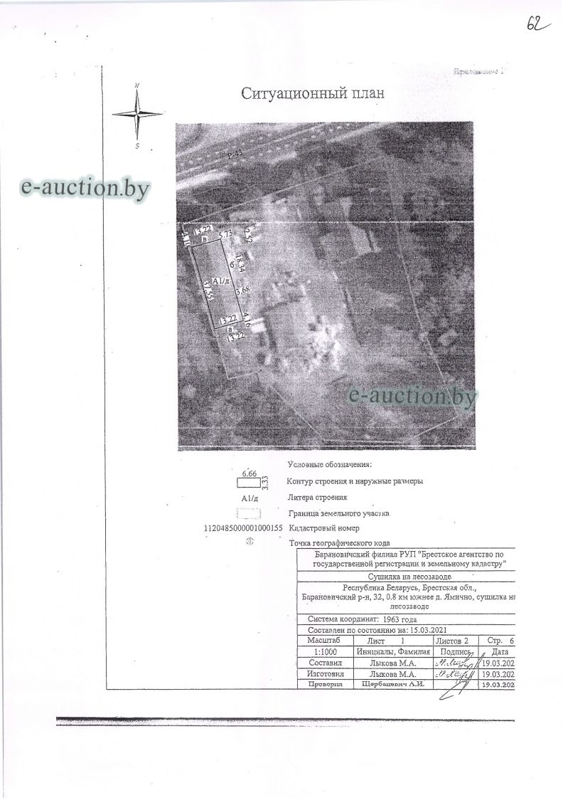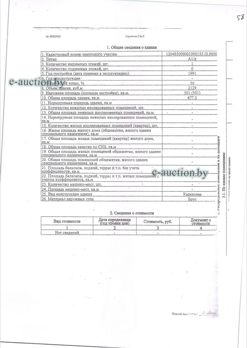 Сведения о капитальном строении из ЕГРНИ: Наименование: Сушилка на лесозаводе; Назначение: Здание специализированное для обработки древесины и производства изделий из дерева, включая мебель; Составные части и принадлежности: три навеса; Право собственности: Гражданин Республики Беларусь (Доля 1/2); Кадастровый номер земельного участка, на котором расположено капитальное строение: 120485000001000155, площадью 0.9696 га (Право аренды, доля: 1/2). Отдельный земельный участок для обслуживания капитального строения не выделен. Целевое назначение земельного участка: Для строительства и обслуживания сушилки на лесозаводе с пристроенным зданием конторы и лесоцеха с подвалом; Назначение земельного участка в соответствии с единой классификацией назначения объектов недвижимого имущества: Земельный участок для размещения объектов обрабатывающей промышленности. |