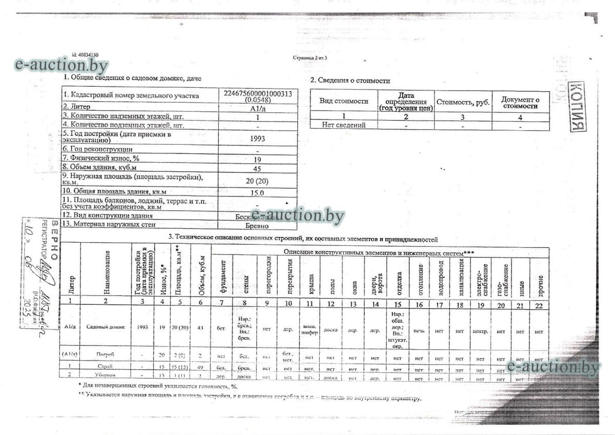 Сведения о капитальном строении из ЕГРНИ: Наименование: садовый домик; Назначение: садовый, дачный домик (дача); Составные части и принадлежности: погреб, сарай, уборная. Расположено на земельном участке с кад. № 224675600001000313 площадью 0.0548 га (право пожизненного наследуемого владения). Целевое назначение земельного участка: для коллективного садоводства. Назначение земельного участка в соответствии с единой классификацией назначения объектов недвижимого имущества: земельный участок для коллективного садоводства. Водоохранная зона водного объекта пруда № 1, площадь 0.0548 га. Охранная зона линии электропередачи напряжением до 1000 В, площадь 0.0034 га. Обращаем ваше внимание: в соответствии с положением о садоводческих товариществах, утверждённым Указом Президента Республики Беларусь № 155 от 30.05.2023, членами товарищества могут быть граждане Республики Беларусь, иностранные граждане и лица без гражданства, имеющие в границах товарищества на праве частной собственности, пожизненного наследуемого владения или аренды земельные участки (доли в праве на них), предоставленные для коллективного садоводства. |