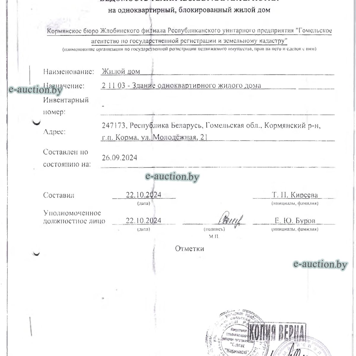 | Местоположение имущества | Гомельская область, Кормянский р-н, гп Корма, ул. Молодежная, 21 |