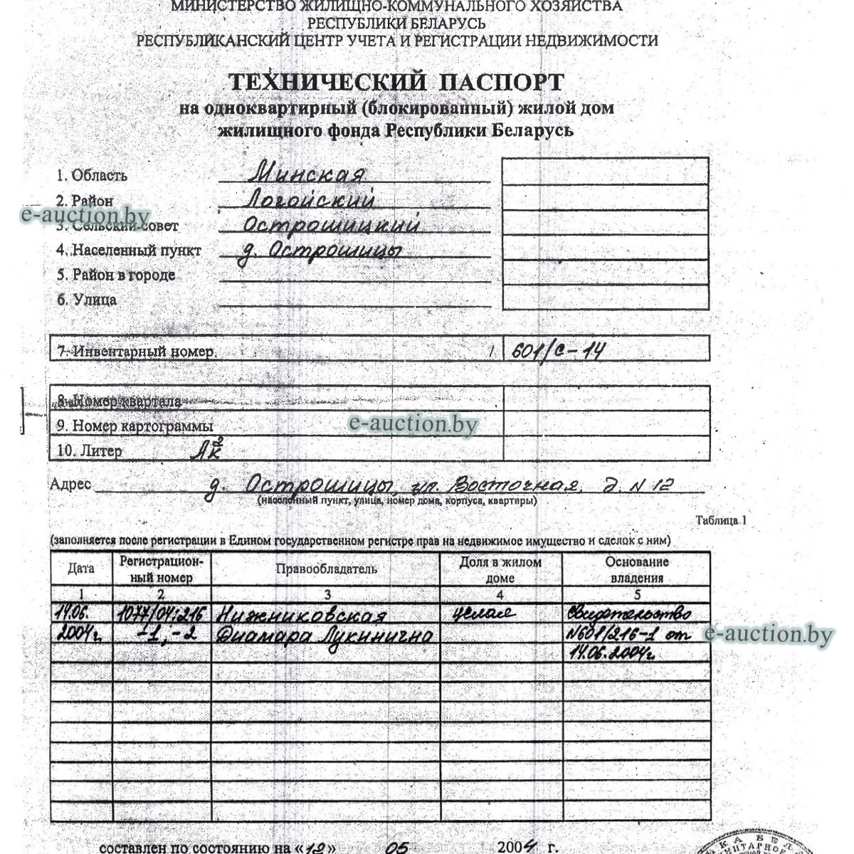 | Местоположение имущества | Минская область, Логойский р-н, Острошицкий с/с, аг. Острошицы, ул. Восточная, 12 |