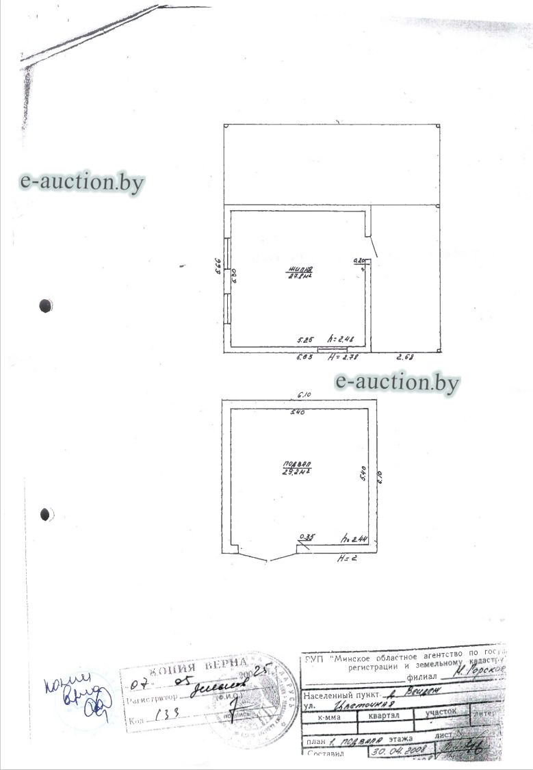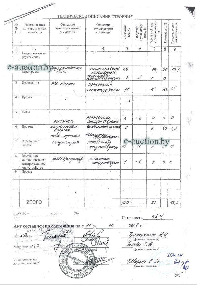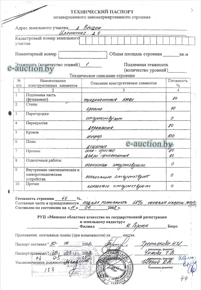 Лот представляет собой объект недвижимости в составе капитального строения и земельного участка Сведения о капитальном строении из ЕГРНИ: Адрес (местоположение): Минская обл., Пуховичский р-н, Новоселковский с/с, д.Вендеж, ул.Цветочная, д.4; Наименование: незавершенное законсервированное капитальное строение; Назначение: Здание неустановленного назначения; Составные части и принадлежности: незавершенное законсервированное капитальное строение с подвалом, теневым навесом-1, теневым навесом-2. Готовность строения-66%. Готовность подвала - 58%; Право собственности: Гражданин Республики Беларусь. Кадастровый номер земельного участка, на котором расположено капитальное строение: 624484301101000028, площадью 0.0954 га (Право собственности); Целевое назначение земельного участка: строительство и обслуживание жилого дома; Назначение земельного участка в соответствии с единой классификацией назначения объектов недвижимого имущества: Земельный участок для размещения объектов усадебной застройки (строительства и обслуживания одноквартирного (блокированного) жилого дома, обслуживания зарегистрированной организацией по государственной регистрации недвижимого имущества, прав на него и сделок с ним квартиры в блокированном жилом доме); Право собственности: Гражданин Республики Беларусь. *фактический адрес не совпадает с адресом из ЕГРНИ. |