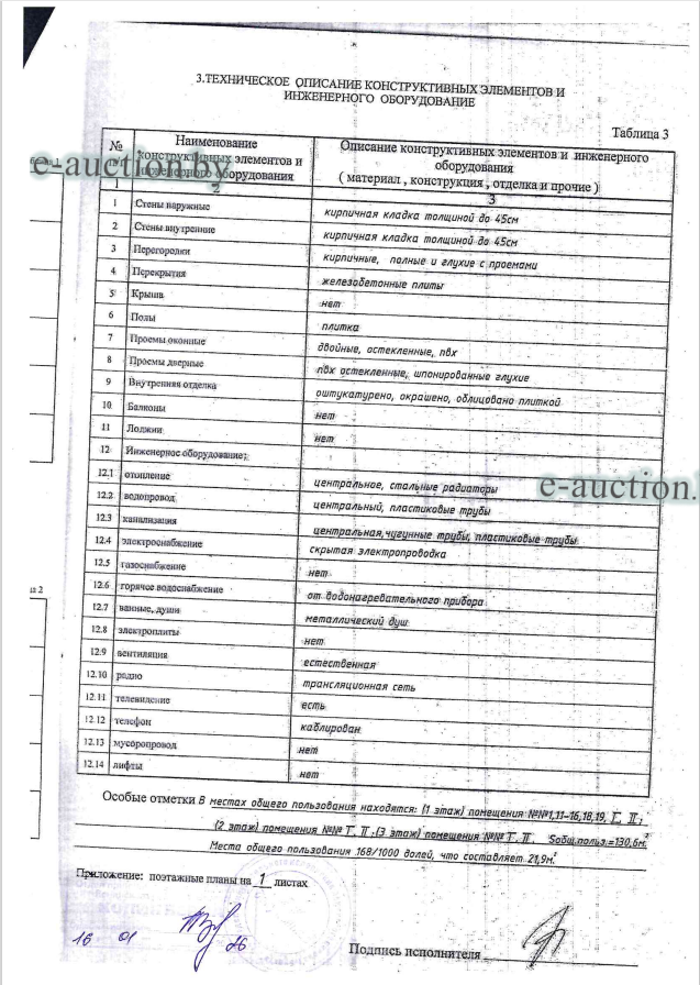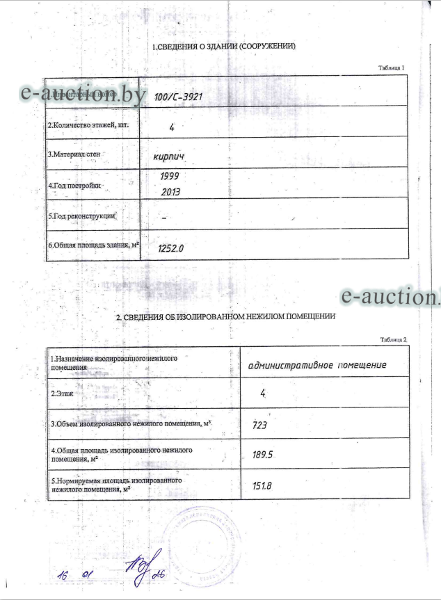 Сведения об изолированном помещении или машино-месте: Наименование: Административное помещение; Назначение: Административное помещение; Право собственности: Индивидуальный предприниматель, резидент Республики Беларусь; Примечания: Административное помещение. В местах общего пользования находятся: 1 этаж - помещения №№ 1, 11-16, 18, 19 , I, II; 2 этаж - помещения №№ I, II; 3 этаж - помещения №№ I, II; площадь общего пользования = 130,6 кв.м. Места общего пользования 168/1000 долей, что составляет 21,9 кв.м. |