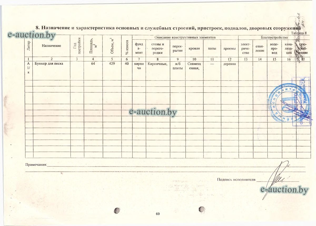 Сведения о капитальном строении: Наименование: Одноэтажное кирпичное нежилое здание бункера для песка. Назначение: Здание специализированное коммунального хозяйства Составные части и принадлежности: Одноэтажное кирпичное нежилое здание бункера для песка. Право хозяйственного ведения. Сведения о земельном участке: Кадастровый номер земельного участка, на котором расположено капитальное строение: 324750100003000051 (право постоянного пользования). Отдельный земельный участок для обслуживания строения не выделен. |