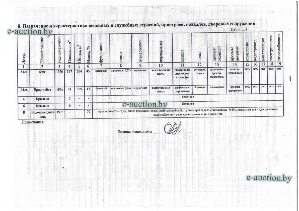 Сведения о капитальном строении: Наименование: здание бани Назначение: Здание специализированное коммунального хозяйства Составные части и принадлежности: кирпичная пристройка, два крыльца, водопроводная сеть Сведения о земельном участке: Кадастровый номер земельного участка, на котором расположено капитальное строение: 323080401101000075 площадью 0.1049 га (право постоянного пользования). Находится в водоохранных зонах водных объектов вне прибрежных полос, площадь 0.1049 га Целевое назначение земельного участка: Земельный участок для обслуживания здания бани Назначение земельного участка в соответствии с единой классификацией назначения объектов недвижимого имущества: Земельный участок для размещения объектов бытового обслуживания населения |
