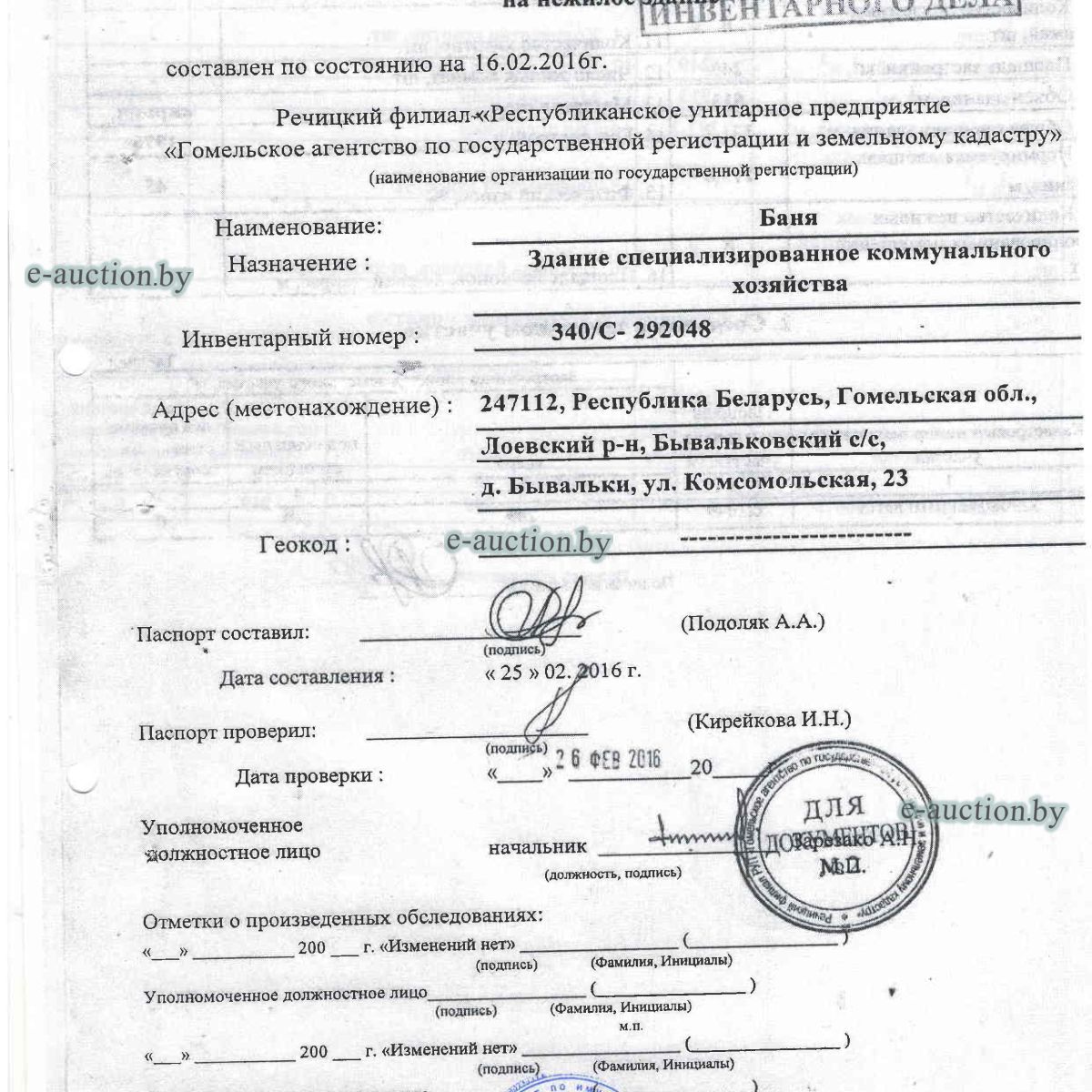| Местоположение имущества | Гомельская область, Лоевский р-н, д. Бывальки, ул. Комсомольская, 23 |