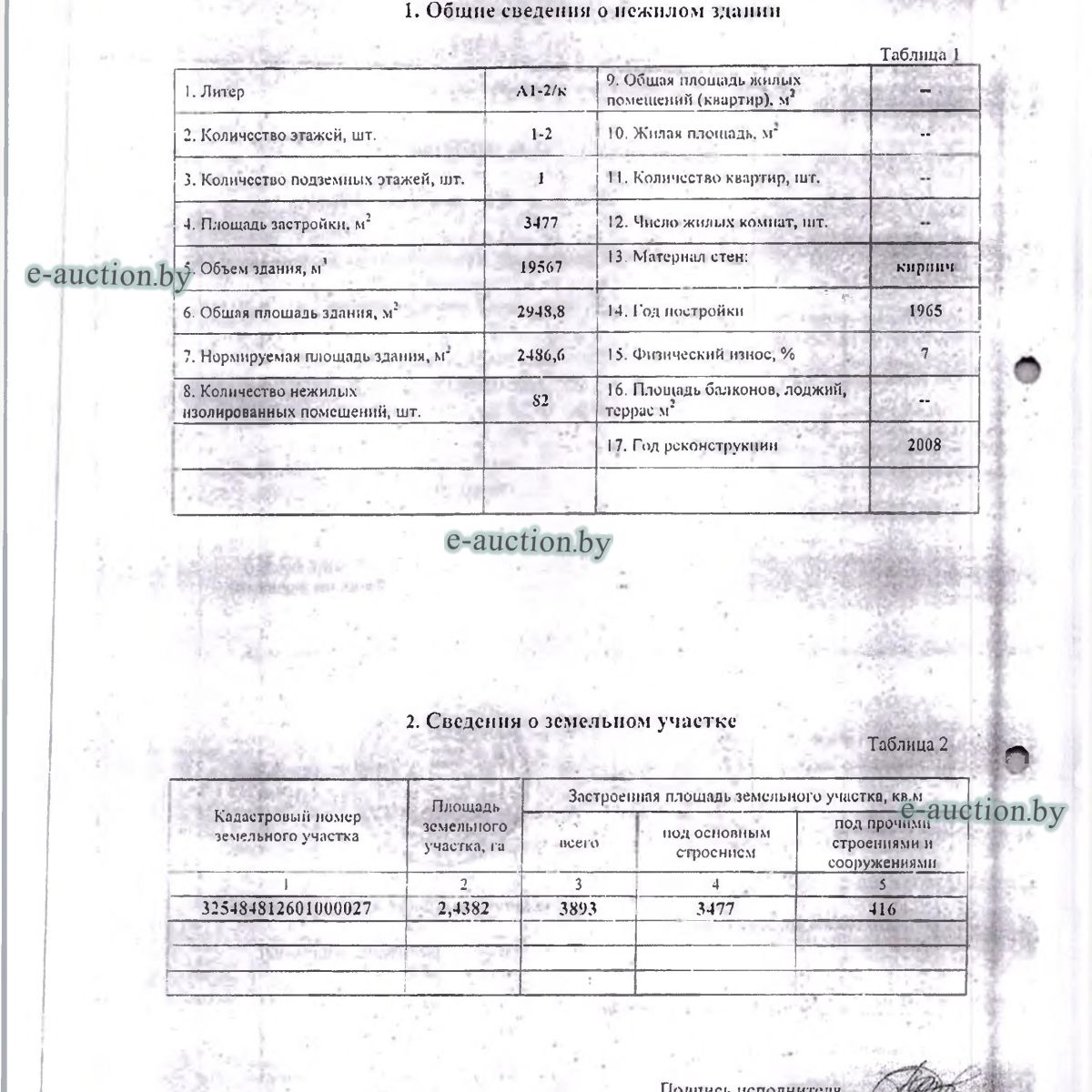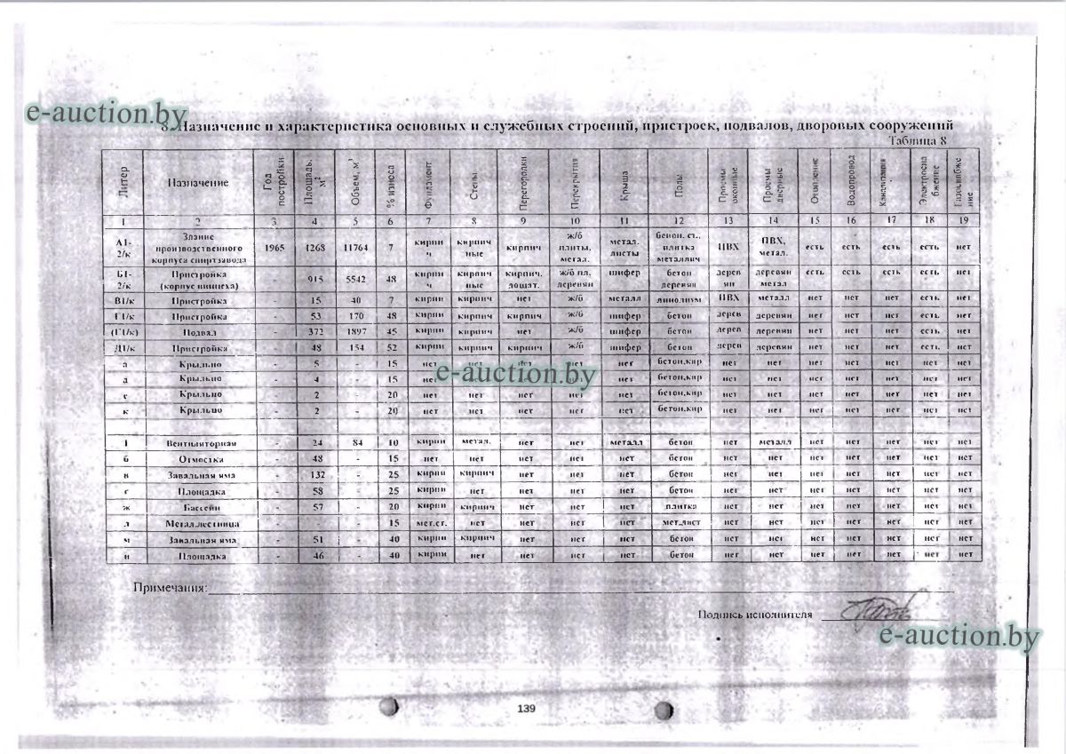 Сведения о капитальном строении: Наименование: Здание производственного корпуса спиртозавода Назначение: Здание специализированное для производства продуктов питания, включая напитки, и табака Составные части и принадлежности: кирпичная двухэтажная пристройка (корпус винцеха), три кирпичные пристройки, подвал, четыре крыльца, вентиляторная, отмостка, две завальных ямы, две площадки, бассейн, метал. лестница Право хозяйственного ведения Сведения о земельном участке: Кадастровый номер земельного участка, на котором расположено капитальное строение: 325484812601000027 (право постоянного пользования). Отдельный земельный участок для обслуживания строения не выделен. |