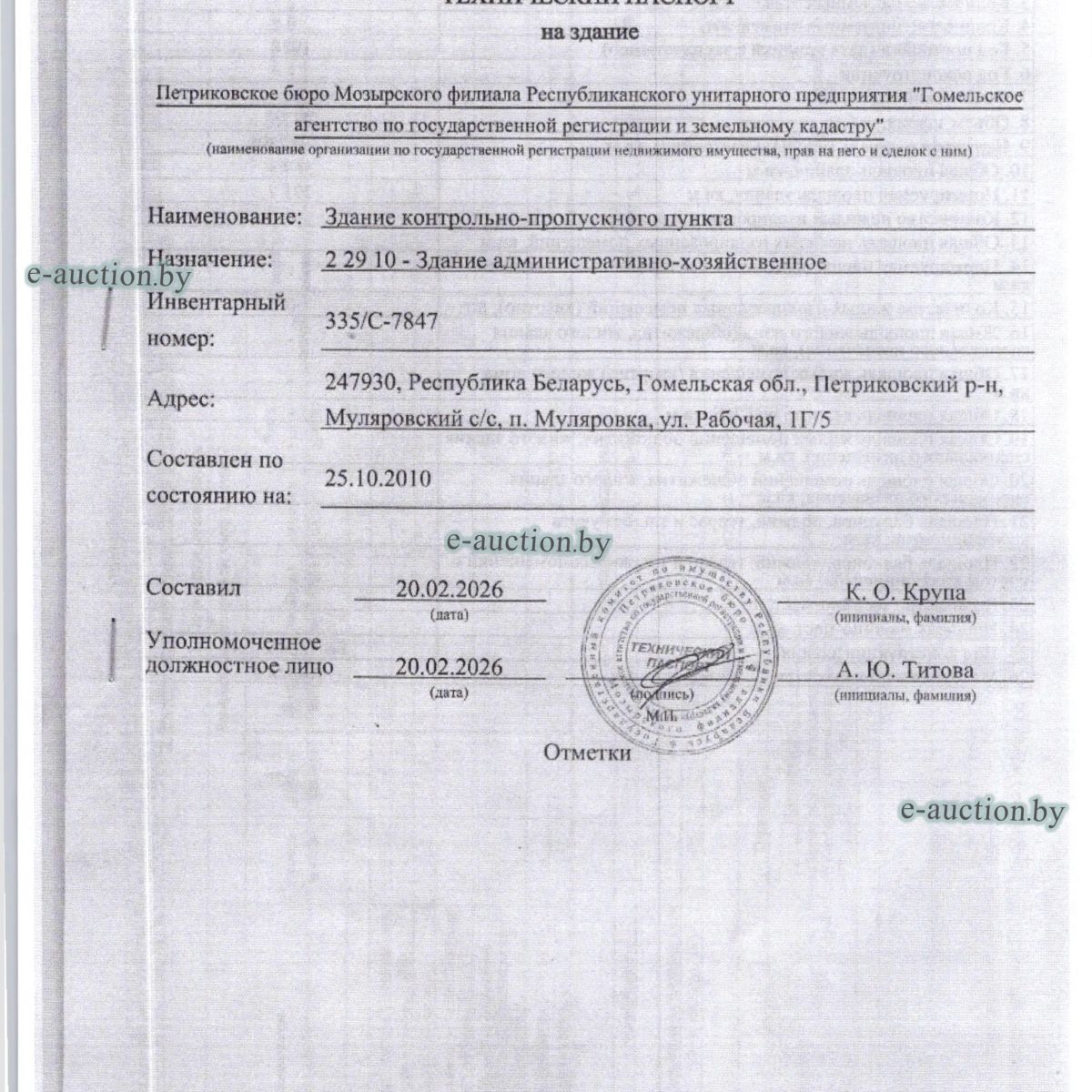 | Местоположение имущества | Гомельская область, Петриковский р-н, п. Муляровка, ул. Рабочая, д.1Г, корп. 5 |