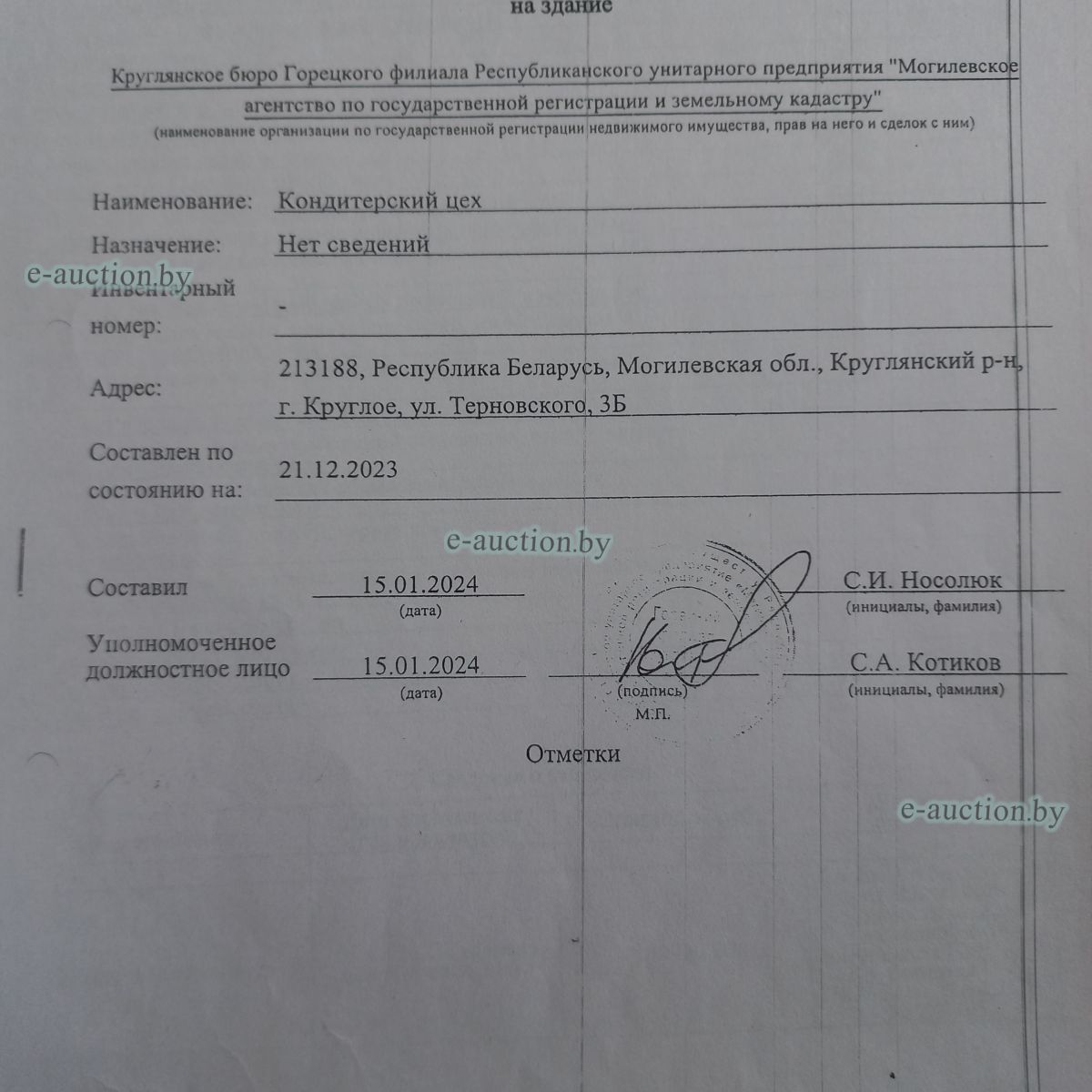 | Местоположение имущества | Могилёвская область, Круглянский р-н, г. Круглое, ул. Терновского 3Б |