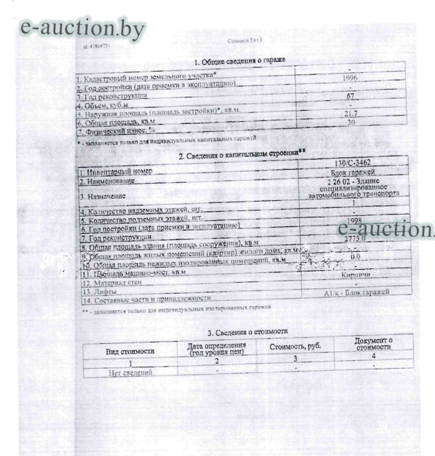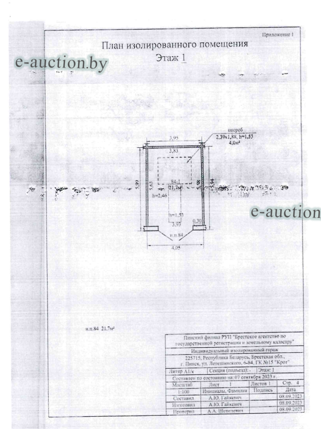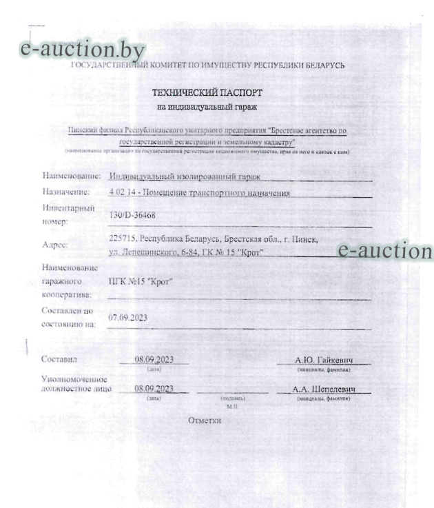 | Местоположение имущества | Брестская область, г. Пинск, ул. Лепешинского, 6-84, ГК № 15 "Крот" |
