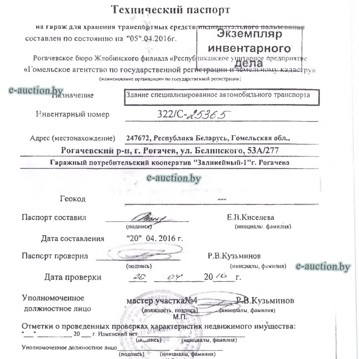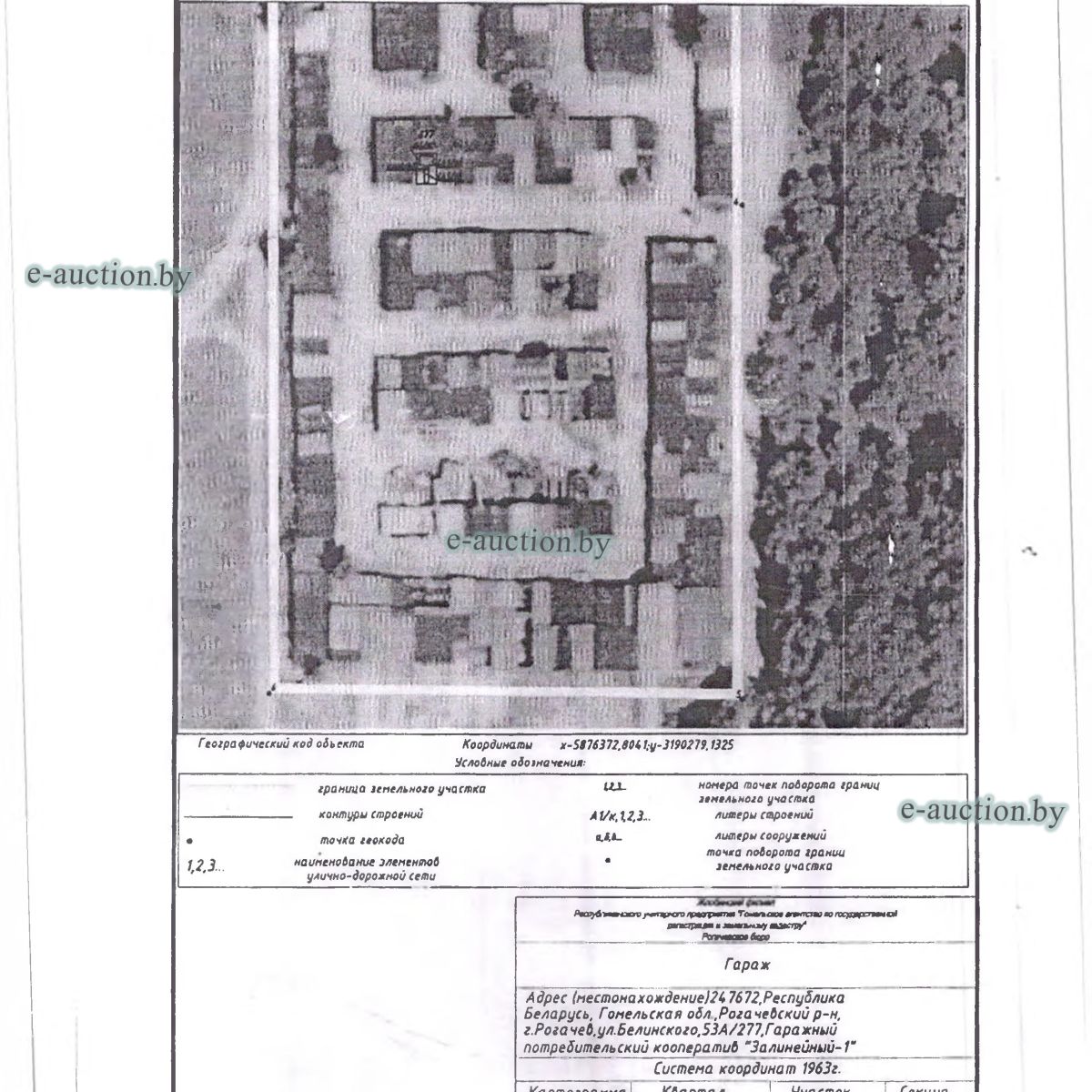 | Местоположение имущества | Гомельская область, Рогачевский р-н, г. Рогачев, ул. Белинского, 53А/277, Гаражный потребительский кооператив "Залинейный-1" г. Рогачева |