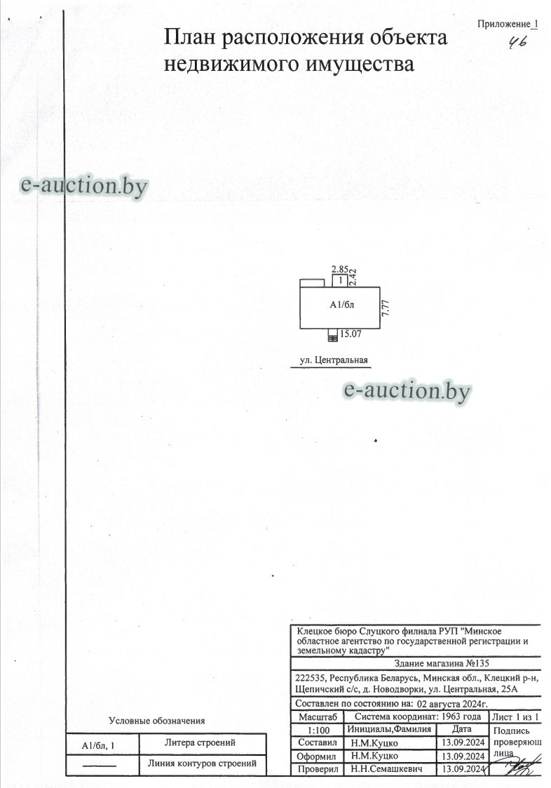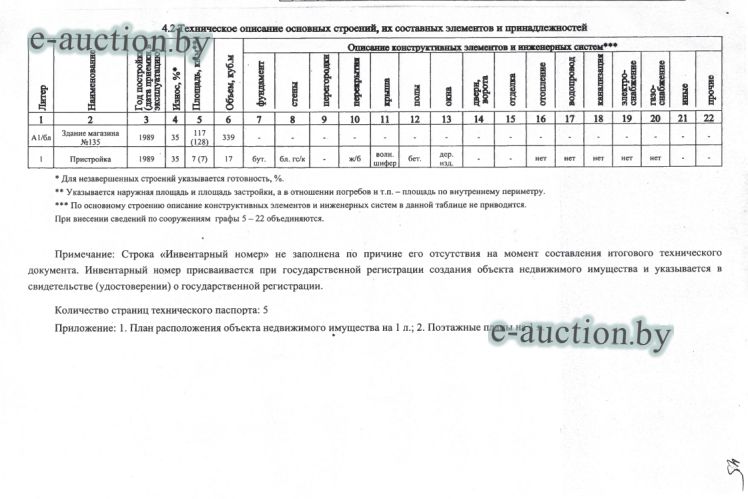 Сведения о капитальном строении из ЕГРНИ: Наименование: Здание магазина №135; Назначение: Здание специализированное розничной торговли; Составные части и принадлежности: А1/бл-Здание магазина №135,1-Пристройка; Право собственности: Клецкое районное потребительское общество; Кадастровый номер земельного участка, на котором расположено капитальное строение: 622585503601000106, площадью 0.0862 га (Право аренды) Целевое назначение земельного участка: для строительства и обслуживания здания магазина № 135; Назначение земельного участка в соответствии с единой классификацией назначения объектов недвижимого имущества: Земельный участок для размещения объектов розничной торговли. Минским областным исполнительным комитетом в целях упорядочения дальнейшего использования объектов недвижимости, реализуемых с аукционов (электронных торгов), принято решение от 15.11.2023 № 1119. В соответствии с решением необходимо обеспечить для случаев реализации объектов недвижимости, а именно: капитальные строения (здание, сооружения), незавершенные законсервированные и незаконсервированные капитальные строения, находящиеся в собственности Минской области, собственности ее административно-территориальных единиц, собственности хозяйственных обществ (товариществ), в уставных фондах которых более 50 процентов акций (долей) находятся в собственности Минской области и (или) ее административно-территориальных единиц, с аукционов (электронных торгов) в исполнительном производстве обязательными следующие условия: - обеспечение безопасности и ограничение доступа на недвижимое имущество с даты подписания акта о приемке-передаче; - использование земельного участка и объекта недвижимости в соответствии с назначением, определенным райгорисполкомами; - поддержание надлежащего санитарного, технического состояния объекта недвижимости и земельного участка; - срок начала и период проведения реконструкции объектов недвижимости (при необходимости ее проведения) и (или) возведения недвижимого имущества после сноса приобретенного объекта недвижимости либо сноса отдельных объектов, входящих в состав приобретенного объекта недвижимости, которые не могут быть использованы; - срок завершения строительства незавершенных законсервированных и незаконсервированных капитальных строений. |