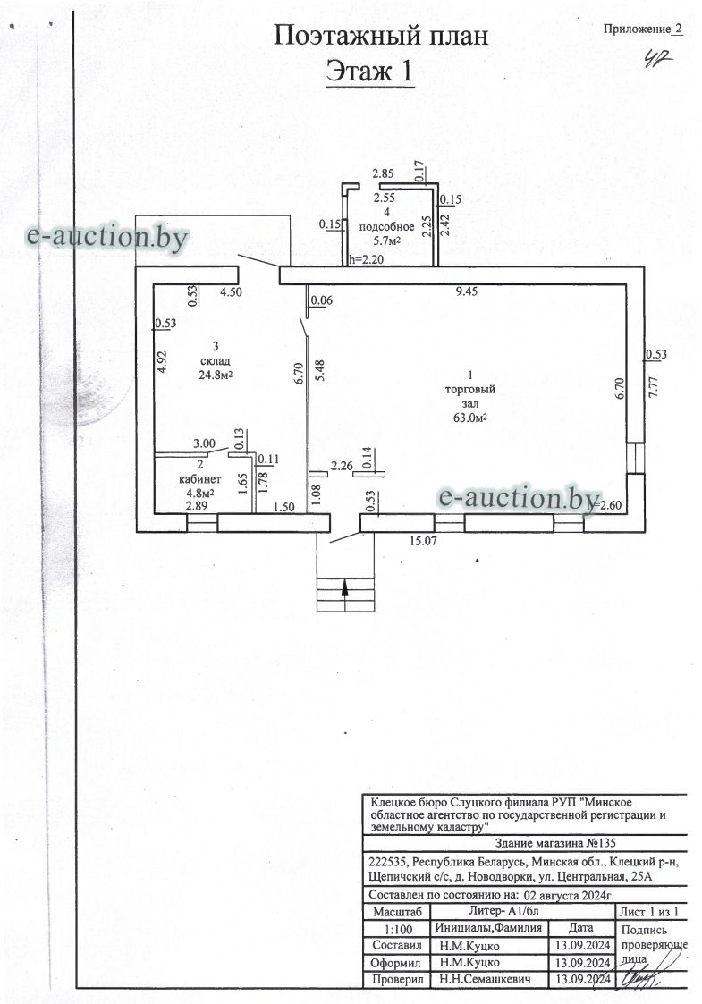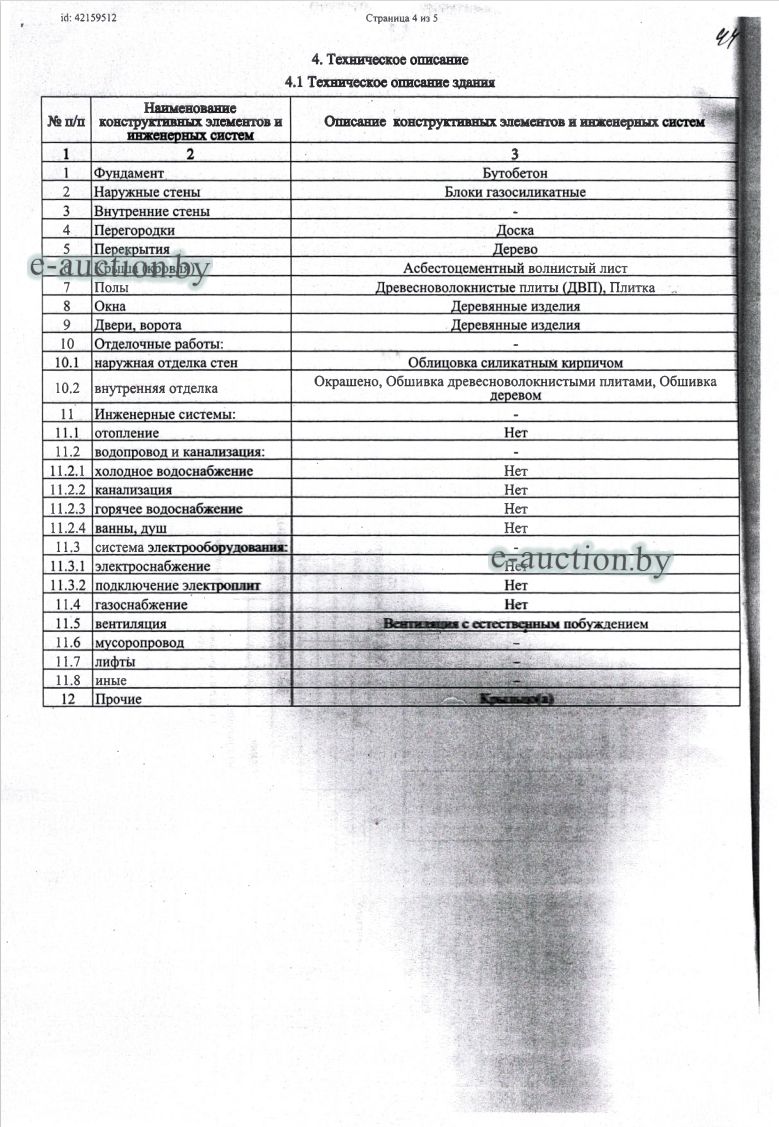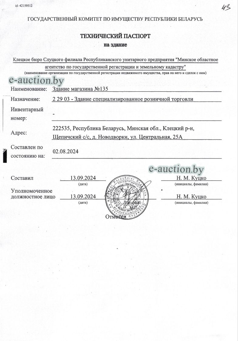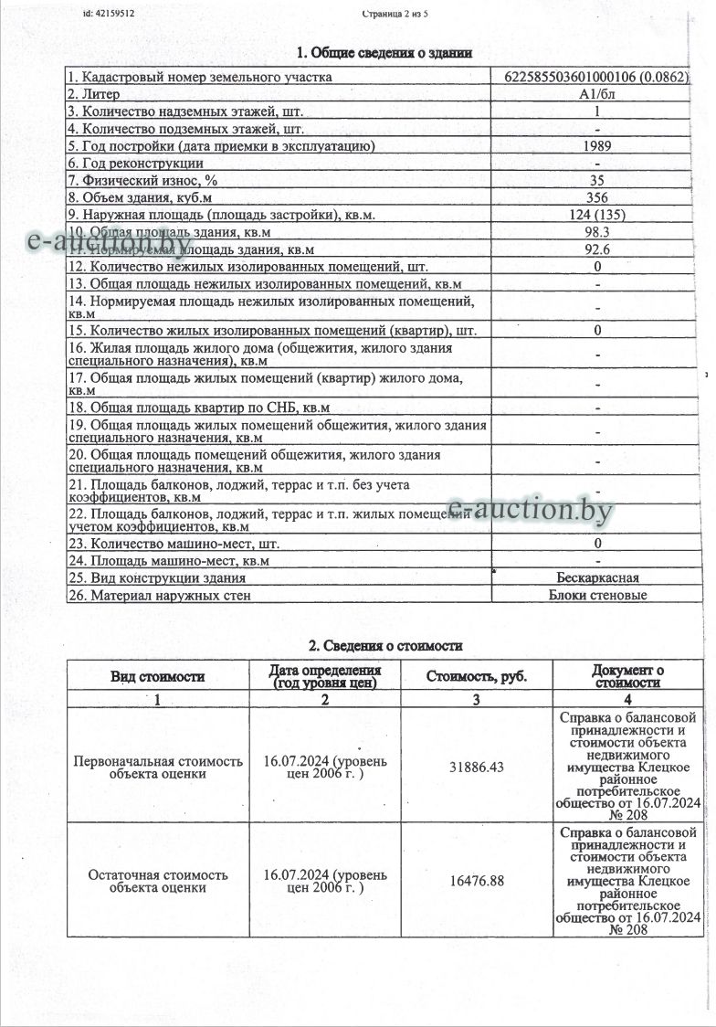 Сведения о капитальном строении из ЕГРНИ: Наименование: Здание магазина №135; Назначение: Здание специализированное розничной торговли; Составные части и принадлежности: А1/бл-Здание магазина №135,1-Пристройка; Право собственности: Клецкое районное потребительское общество; Кадастровый номер земельного участка, на котором расположено капитальное строение: 622585503601000106, площадью 0.0862 га (Право аренды) Целевое назначение земельного участка: для строительства и обслуживания здания магазина № 135; Назначение земельного участка в соответствии с единой классификацией назначения объектов недвижимого имущества: Земельный участок для размещения объектов розничной торговли. Минским областным исполнительным комитетом в целях упорядочения дальнейшего использования объектов недвижимости, реализуемых с аукционов (электронных торгов), принято решение от 15.11.2023 № 1119. В соответствии с решением необходимо обеспечить для случаев реализации объектов недвижимости, а именно: капитальные строения (здание, сооружения), незавершенные законсервированные и незаконсервированные капитальные строения, находящиеся в собственности Минской области, собственности ее административно-территориальных единиц, собственности хозяйственных обществ (товариществ), в уставных фондах которых более 50 процентов акций (долей) находятся в собственности Минской области и (или) ее административно-территориальных единиц, с аукционов (электронных торгов) в исполнительном производстве обязательными следующие условия: - обеспечение безопасности и ограничение доступа на недвижимое имущество с даты подписания акта о приемке-передаче; - использование земельного участка и объекта недвижимости в соответствии с назначением, определенным райгорисполкомами; - поддержание надлежащего санитарного, технического состояния объекта недвижимости и земельного участка; - срок начала и период проведения реконструкции объектов недвижимости (при необходимости ее проведения) и (или) возведения недвижимого имущества после сноса приобретенного объекта недвижимости либо сноса отдельных объектов, входящих в состав приобретенного объекта недвижимости, которые не могут быть использованы; - срок завершения строительства незавершенных законсервированных и незаконсервированных капитальных строений. |