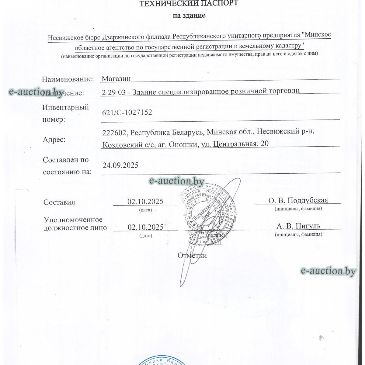 | Местоположение имущества | Минская область, Несвижский р-н, Козловский с/с, аг. Оношки, ул. Центральная, 20 |