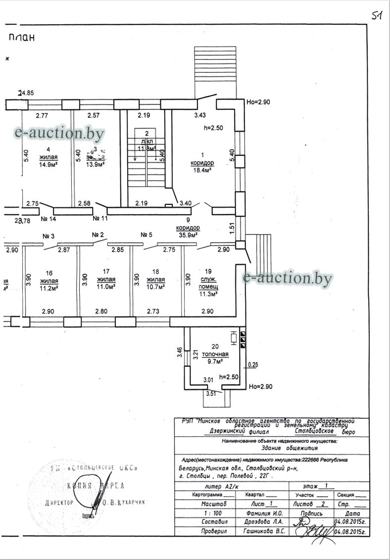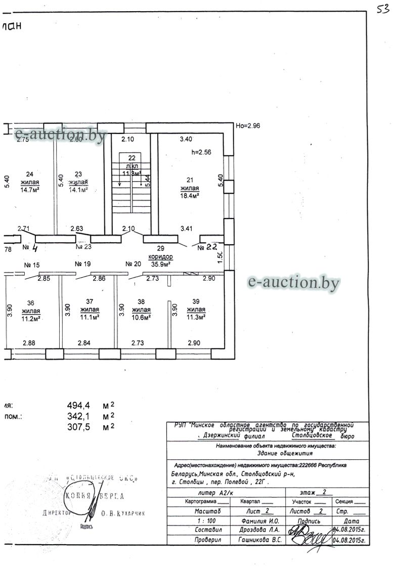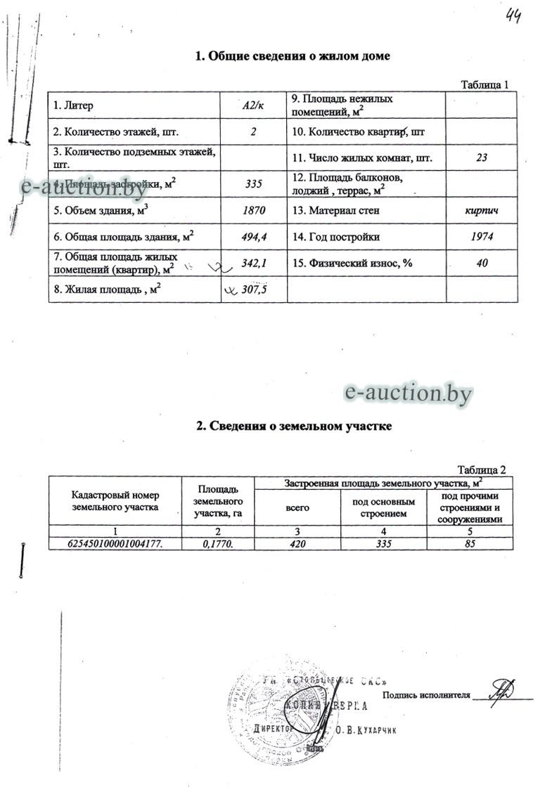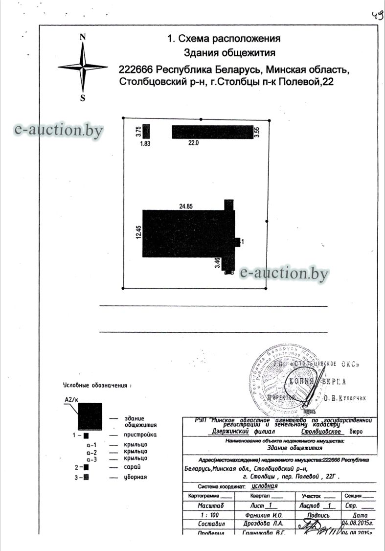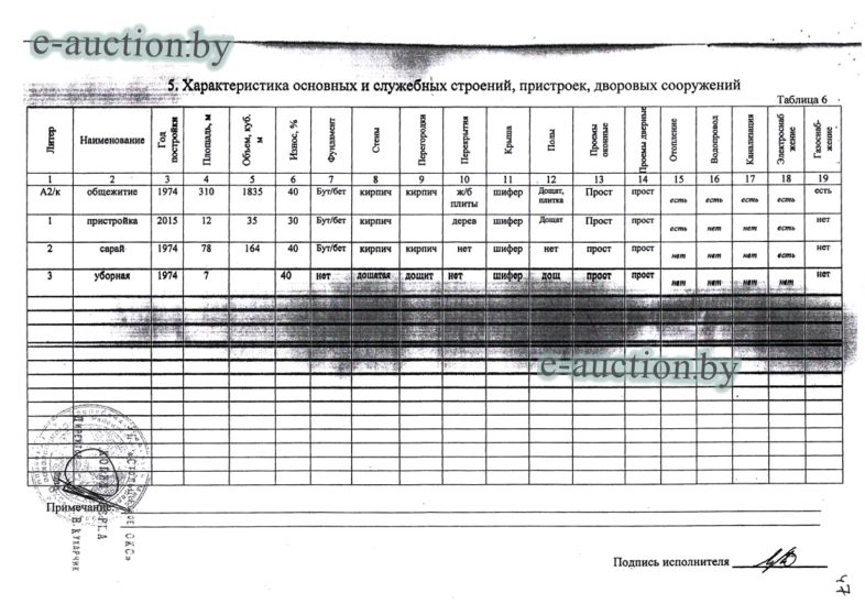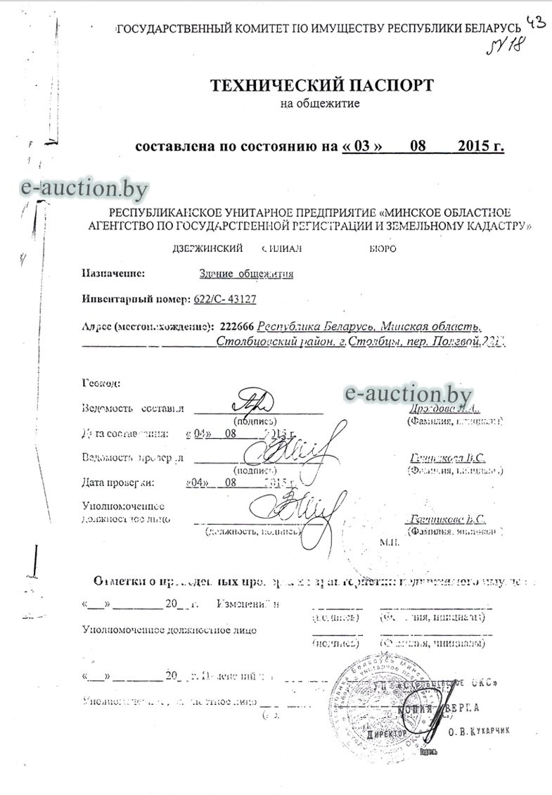 Сведения о капитальном строении из ЕГРНИ: Наименование: здание общежития; Назначение: Здание общежития; Составные части и принадлежности: целое двухэтажное кирпичное здание общежития А2/к с кирпичной пристройкой 1, кирпичным сараем 2, дощатой уборной 3; Право хозяйственного ведения: Районное унитарное предприятие "Столбцовское ОКС". Кадастровый номер земельного участка, на котором расположено капитальное строение: 625450100001004177, площадью 0.1770 га (Право аренды).Целевое назначение земельного участка: для обслуживания здания общежития; Назначение земельного участка в соответствии с единой классификацией назначения объектов недвижимого имущества: Земельный участок для размещения объектов иного назначения. Минским областным исполнительным комитетом в целях упорядочения дальнейшего использования объектов недвижимости, реализуемых с аукционов (электронных торгов), принято решение от 15.11.2023 № 1119. В соответствии с решением необходимо обеспечить для случаев реализации объектов недвижимости, а именно: капитальные строения (здание, сооружения), незавершенные законсервированные и незаконсервированные капитальные строения, находящиеся в собственности Минской области, собственности ее административно-территориальных единиц, собственности хозяйственных обществ (товариществ), в уставных фондах которых более 50 процентов акций (долей) находятся в собственности Минской области и (или) ее административно-территориальных единиц, с аукционов (электронных торгов) в исполнительном производстве обязательными следующие условия: - обеспечение безопасности и ограничение доступа на недвижимое имущество с даты подписания акта о приемке-передаче; - использование земельного участка и объекта недвижимости в соответствии с назначением, определенным райгорисполкомами; - поддержание надлежащего санитарного, технического состояния объекта недвижимости и земельного участка; - срок начала и период проведения реконструкции объектов недвижимости (при необходимости ее проведения) и (или) возведения недвижимого имущества после сноса приобретенного объекта недвижимости либо сноса отдельных объектов, входящих в состав приобретенного объекта недвижимости, которые не могут быть использованы; - срок завершения строительства незавершенных законсервированных и незаконсервированных капитальных строений. |