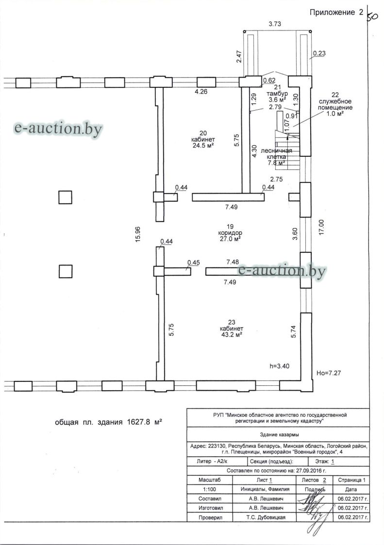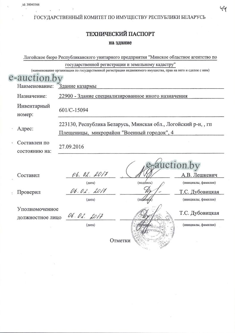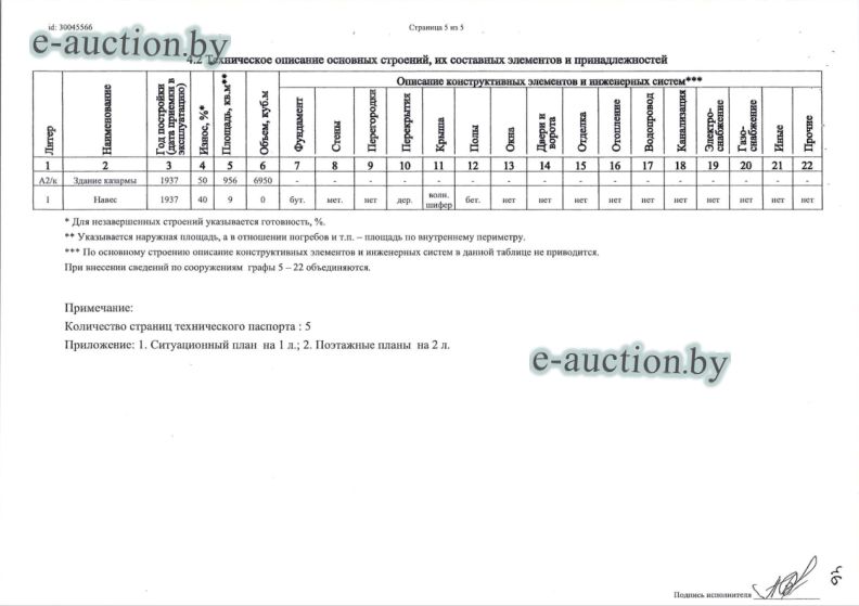 Сведения о капитальном строении из ЕГРНИ: Общая площадь (протяженность): 1606.6; Наименование: Здание казармы 4/1; Назначение: Здание специализированное иного назначения; Составные части и принадлежности: Двухэтажное кирпичное здание казармы 4/1 с двумя террасами 1,2; Право собственности: Гражданин Республики Беларусь. *по данным технического паспорта общая площадь составляет 1627,8 кв.м. Право хозяйственного ведения: Торговое частное унитарное предприятие "САНТИКА". Кадастровый номер земельного участка, на котором расположено капитальное строение: 623255700001001627, площадью 0.1089 га (Право аренды, Торговое частное унитарное предприятие "САНТИКА"); Назначение земельного участка в соответствии с единой классификацией назначения объектов недвижимого имущества: Земельный участок для размещения объектов иного назначения. |