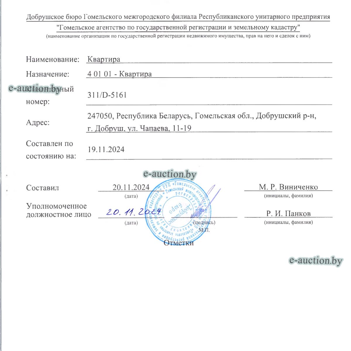 | Местоположение имущества | Гомельская область, Добрушский р-н, г. Добруш, ул. Чапаева, 11-19 |