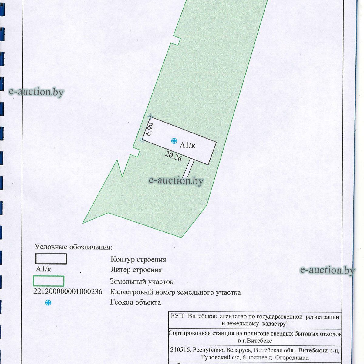 Лот представляет собой объект недвижимости в составе капитального строения и земельного участка. Сведения о капитальном строении из ЕГРНИ: Наименование: сортировочная станция на полигоне твердых бытовых отходов в г. Витебске; Назначение: здание специализированное коммунального хозяйства; Составные части и принадлежности: покрытие, три подпорные стены, асбестовая труба. Принадлежит должнику на праве собственности. Сведения о земельном участке из ЕГРНИ: Кадастровый номер: 221200000001000236; Площадь (га): 0.3850; Целевое назначение земельного участка: земельный участок для строительства и обслуживания сортировочной станции по объекту "Сортировочная станция на полигоне твердых бытовых отходов в г. Витебске"; Назначение земельного участка в соответствии с единой классификацией назначения объектов недвижимого имущества: земельный участок для размещения объектов иного назначения. Ограничения (обременения) прав на земельные участки, расположенные в охранных зонах электрических сетей напряжением до 1000 вольт, площадь 0.0471 га. Принадлежит должнику на праве собственности. |