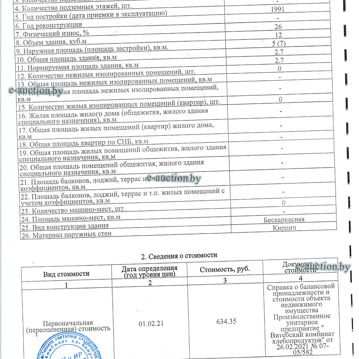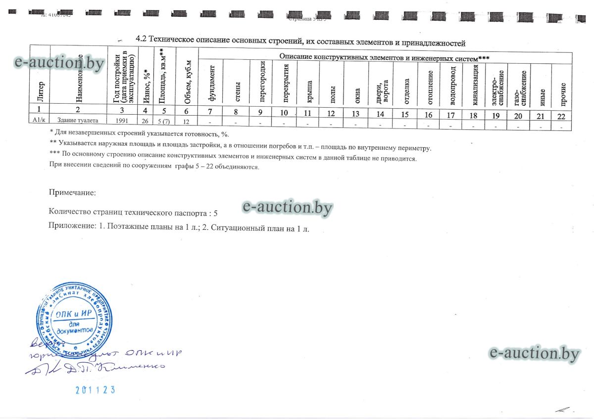 Сведения о капитальном строении из ЕГРНИ: Наименование: здание туалета; Назначение: здание специализированное иного назначения. Право хозяйственного ведения (право собственности: ОАО «Витебский мясокомбинат»). Расположено на земельном участке с кад. № 221850100001000119 площадью 1.7169 га (право постоянного пользования). Отдельный земельный участок под обслуживание капитального строения не выделен. |