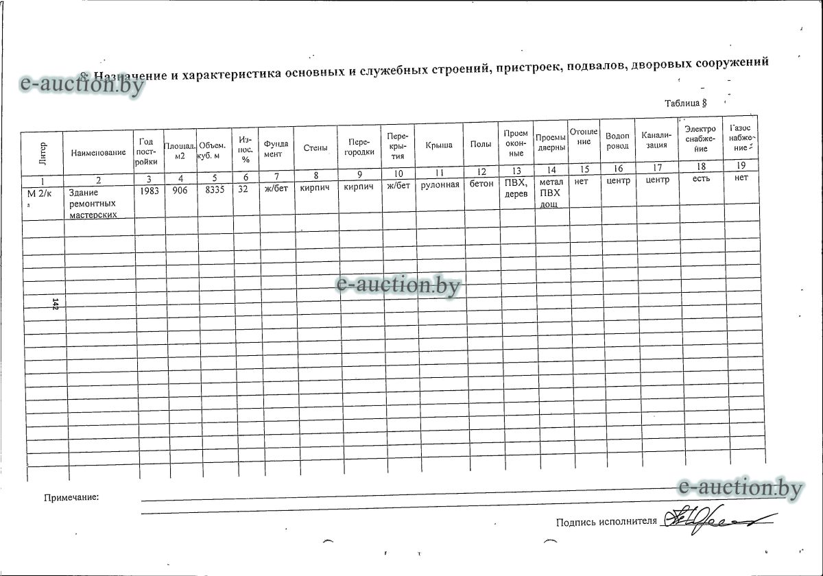 Сведения о капитальном строении: Наименование: Здание ремонтной мастерской Назначение: Здание специализированное для ремонта и (или) технического обслуживания автомобилей (в том числе автомобильные заправочные, зарядные и газонаполнительные станции) Сведения о земельном участке: Кадастровый номер земельного участка, на котором расположено капитальное строение: 324376000001000009 площадью 2.4541 га (право аренды по 15.03.2062). Целевое назначение земельного участка: Земельный участок для обслуживания зданий склада витаминной муки, склада готовой продукции, ремонтной мастерской, материально-технического склада (иных сельскохозяйственных целей) Назначение земельного участка в соответствии с единой классификацией назначения объектов недвижимого имущества: Земельный участок для ведения товарного сельского хозяйства Отдельный земельный участок для обслуживания строения не выделен. |