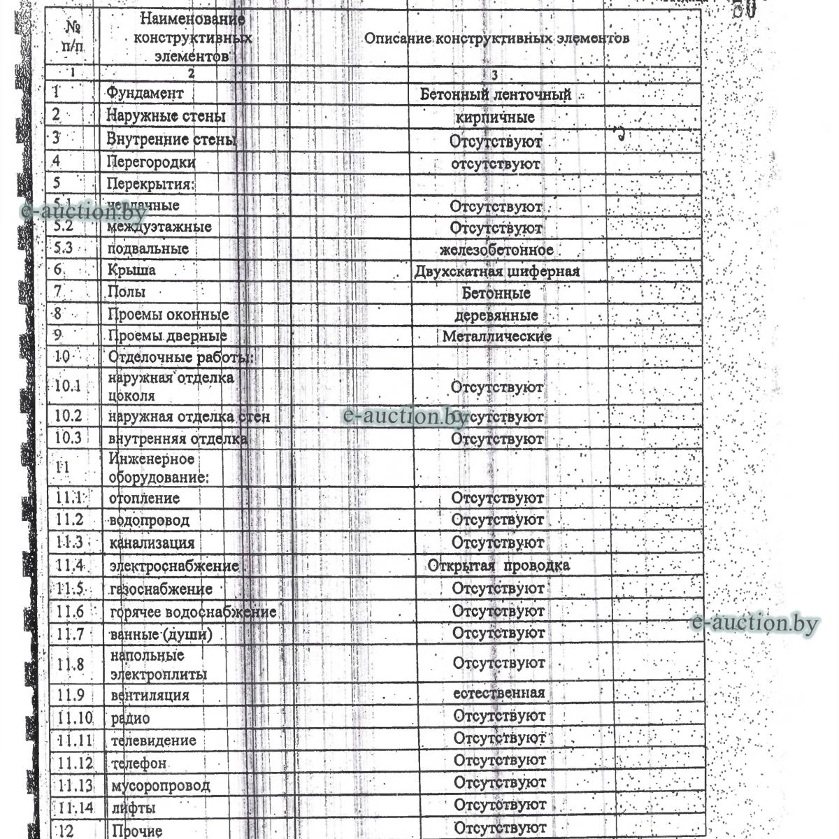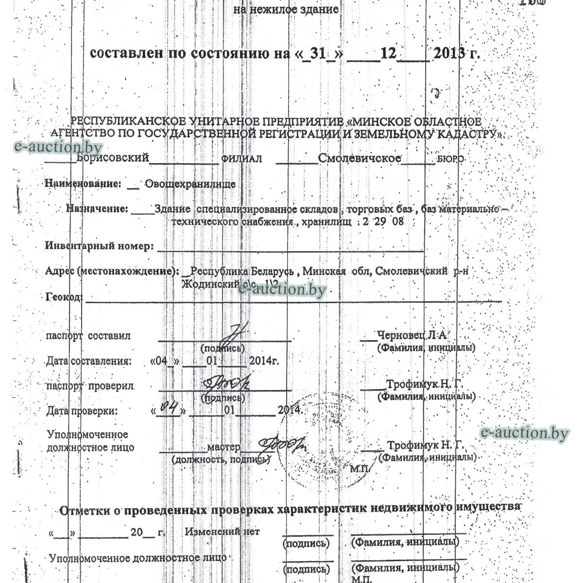 Сведения о капитальном строении из ЕГРНИ: Наименование: овощехранилище; Назначение: здание специализированное складов, торговых баз, баз материально-технического снабжения, хранилищ; Составные части и принадлежности: одноэтажное кирпичное здание овощехранилища с подвалом, сход, крыльцо (А1/к). Принадлежит должнику на праве собственности. Расположено на земельном участке с кад. № 624800000001002303 площадью 0.8144 га (право аренды - доля: 91/100). Отдельный земельный участок под обслуживание капитального строения не выделен. Ограничения (обременения) прав на земельные участки, расположенные в охранных зонах линий электропередачи, площадь 0.0125 га. Ограничения (обременения) прав на земельные участки, расположенные в охранных зонах линий электропередачи, площадь 0.0395 га. Минским областным исполнительным комитетом в целях упорядочения дальнейшего использования объектов недвижимости, реализуемых с аукционов (электронных торгов), принято решение от 15.11.2023 № 1119. В соответствии с решением необходимо обеспечить для случаев реализации объектов недвижимости, а именно: капитальные строения (здание, сооружения), незавершенные законсервированные и незаконсервированные капитальные строения, находящиеся в собственности Минской области, собственности ее административно-территориальных единиц, собственности хозяйственных обществ (товариществ), в уставных фондах которых более 50 процентов акций (долей) находятся в собственности Минской области и (или) ее административно-территориальных единиц, с аукционов (электронных торгов) в исполнительном производстве обязательными следующие условия: - обеспечение безопасности и ограничение доступа на недвижимое имущество с даты подписания акта о приемке-передаче; - использование земельного участка и объекта недвижимости в соответствии с назначением, определенным райгорисполкомами; - поддержание надлежащего санитарного, технического состояния объекта недвижимости и земельного участка; - срок начала и период проведения реконструкции объектов недвижимости (при необходимости ее проведения) и (или) возведения недвижимого имущества после сноса приобретенного объекта недвижимости либо сноса отдельных объектов, входящих в состав приобретенного объекта недвижимости, которые не могут быть использованы; - срок завершения строительства незавершенных законсервированных и незаконсервированных капитальных строений. |