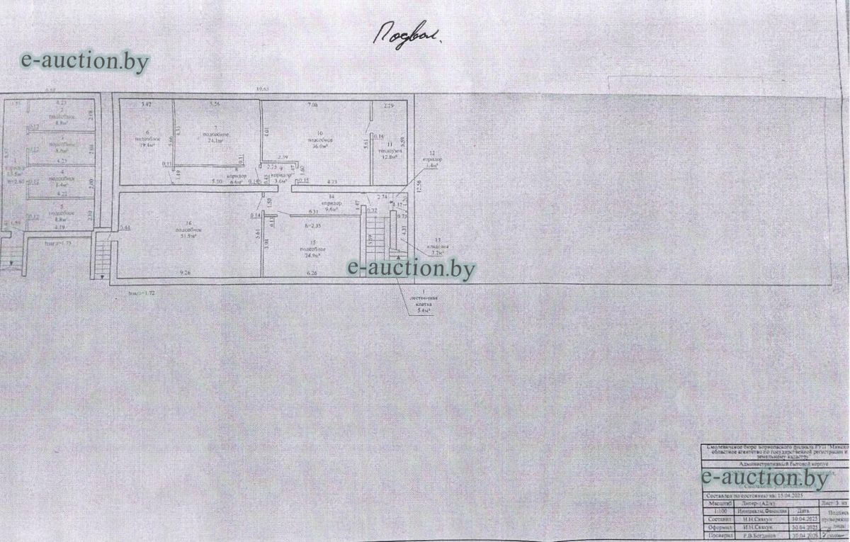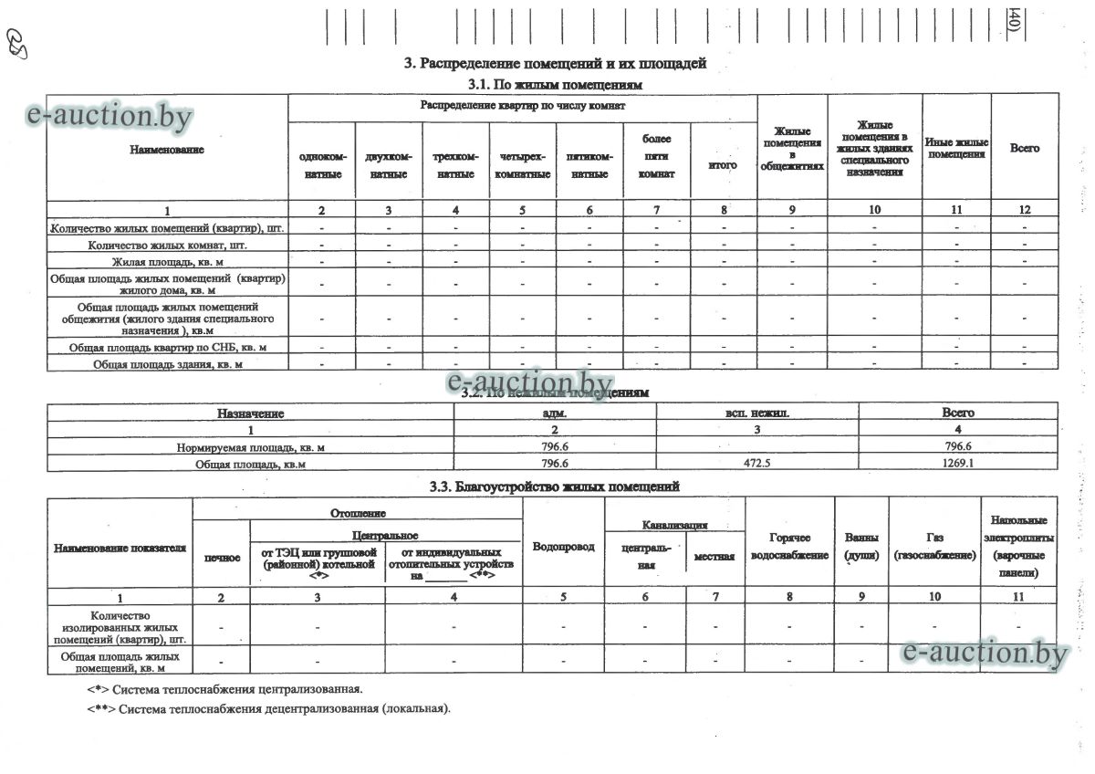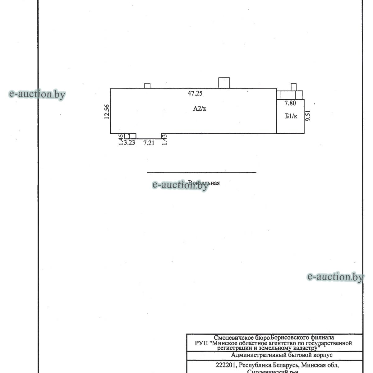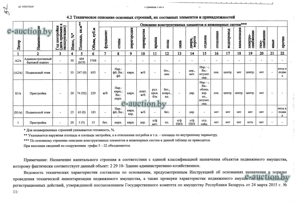 Сведения о капитальном строении из ЕГРНИ: Общая площадь (протяженность): 1011.3; Наименование: административный бытовой корпус; Назначение: здание неустановленного назначения. Составные части и принадлежности: две пристройки. Принадлежит должнику на праве собственности. Имеются несоответствия сведениям, содержащимся в ЕГРНИ, отражённые в ведомости технических характеристик (фото прилагаются). Расположено на земельном участке с кад. № 624850100001000059 площадью 4.4440 га (право аренды). Отдельный земельный участок под обслуживание капитального строения не выделен. Целевое назначение земельного участка: земельный участок для обслуживания производственной базы по адресу г. Смолевичи, ул. Вокзальная, 9. Назначение земельного участка в соответствии с единой классификацией назначения объектов недвижимого имущества: земельный участок для размещения объектов неустановленного назначения. |