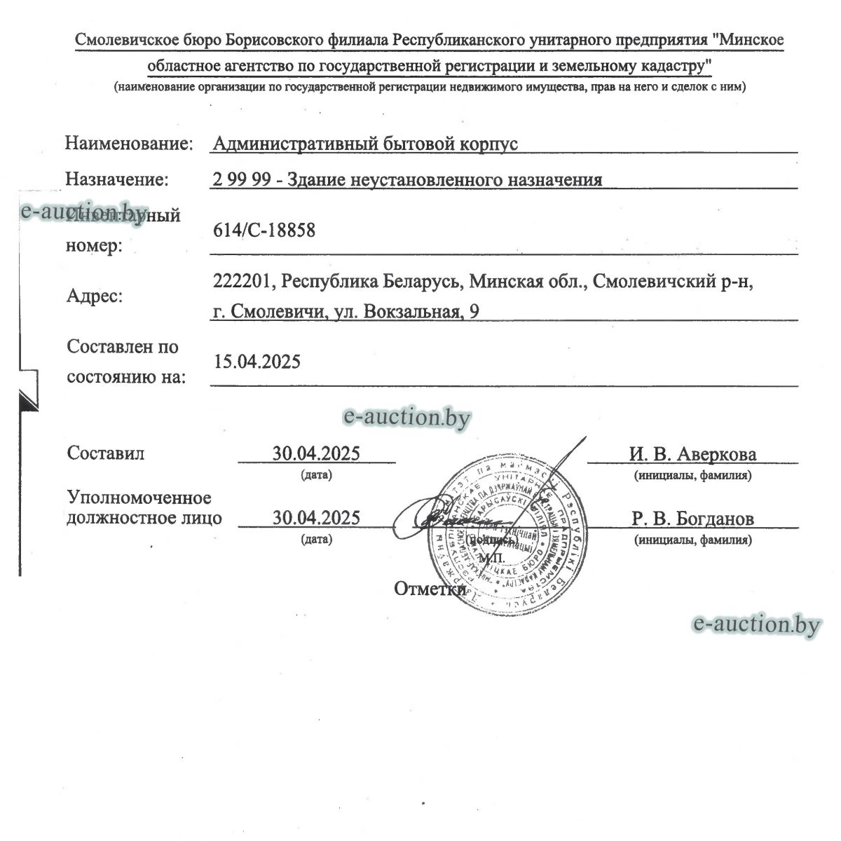 | Местоположение имущества | Минская область, Смолевичский р-н, г. Смолевичи, ул. Вокзальная, д. 9 |