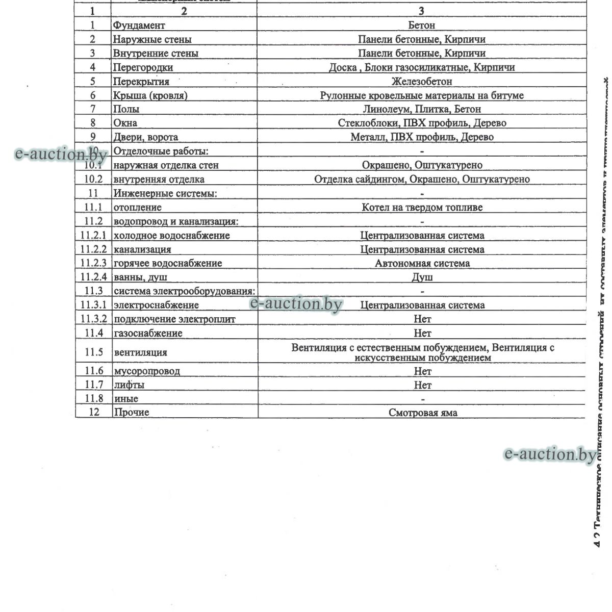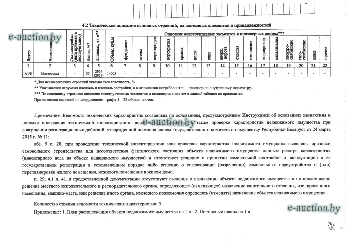 Сведения о капитальном строении из ЕГРНИ: Адрес (местоположение): Минская обл., Смолевичский р-н, г. Смолевичи, ул. Вокзальная, д. 9. Общая площадь (протяженность): 2742.5; Наименование: мастерская; Назначение: сооружение неустановленного назначения. Принадлежит должнику на праве собственности. Имеются несоответствия сведениям, содержащимся в ЕГРНИ, отражённые в ведомости технических характеристик (фото прилагаются). Расположено на земельном участке с кад. № 624850100001000059 площадью 4.4440 га (право аренды). Отдельный земельный участок под обслуживание капитального строения не выделен. Целевое назначение земельного участка: земельный участок для обслуживания производственной базы по адресу г. Смолевичи, ул. Вокзальная, 9. Назначение земельного участка в соответствии с единой классификацией назначения объектов недвижимого имущества: земельный участок для размещения объектов неустановленного назначения. |