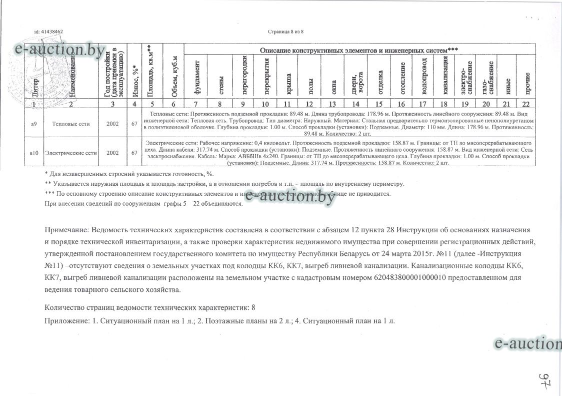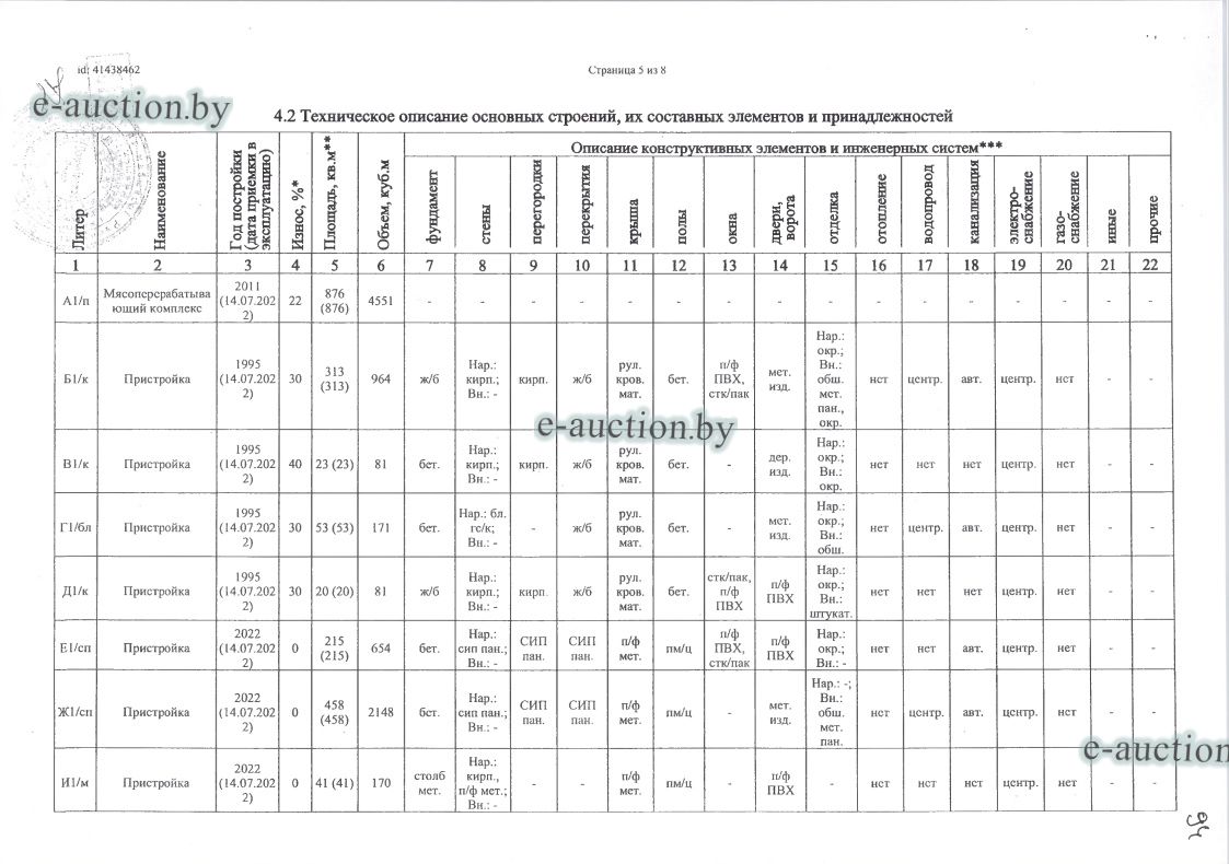 Сведения о капитальном строении из ЕГРНИ: Наименование: Мясоперерабатывающий комплекс; Назначение: Здание специализированное для производства продуктов питания, включая напитки, и табака; Составные части и принадлежности: А1/п-Мясоперерабатывающий комплекс,Б1/к-Пристройка,В1/к, Пристройка,Г1/бл-Пристройка,Д1/к-Пристройка,Е1/сп-Пристройка,Ж1/сп-Пристройка,И1/м, Пристройка,К1/м-Пристройка,Л1/м-Пристройка,М1/к-Пристройка,а6-Навес,а1-Ограждение,а2- Ограждение,а3-Проезды и площадки,а5-Дорожка,а4-Проезды и площадки; Принадлежит должнику на праве собственности. Кадастровый номер земельного участка, на котором расположено капитальное строение: 620400000001000727, площадью 1.4664 га (Право аренды); Целевое назначение земельного участка: Земельный участок для иных сельскохозяйственных целей (обслуживания мясоперерабатывающего комплекса); Назначение земельного участка в соответствии с единой классификацией назначения объектов недвижимого имущества: Земельный участок для иных сельскохозяйственных целей; Отдельный земельный участок для обслуживания капитального строения не выделен. |