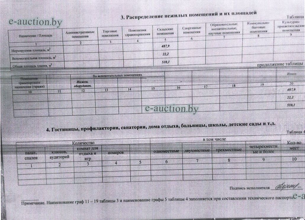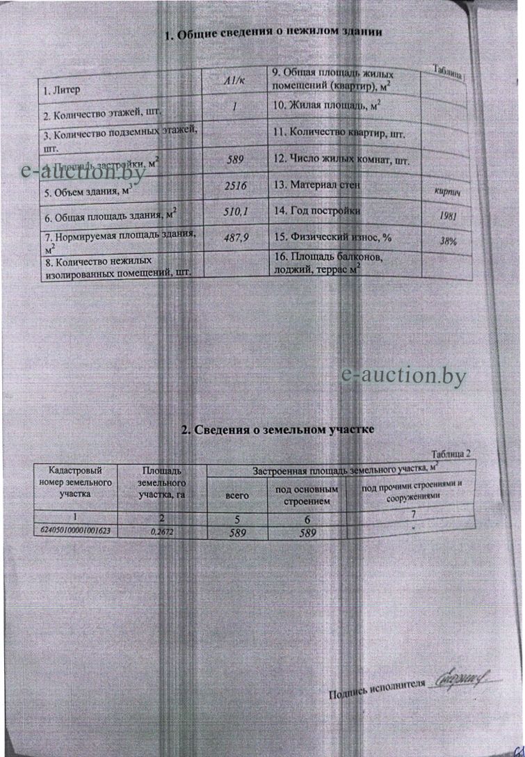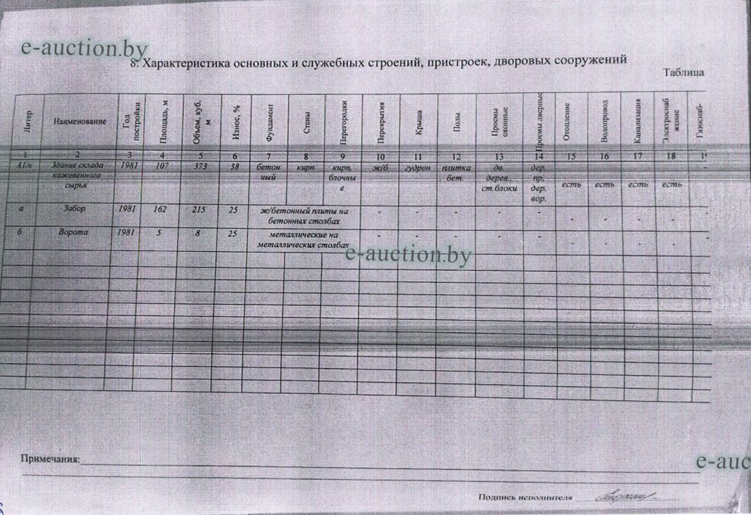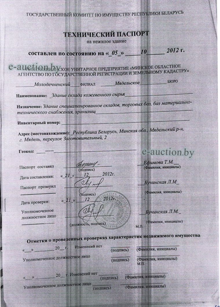 Сведения о капитальном строении из ЕГРНИ: Наименование: здание склада кожевенного сырья; Назначение: Здание специализированное складов, торговых баз, баз материально-технического снабжения, хранилищ; Составные части и принадлежности: кирпичное здание склада кожевенного сырья, забор из железобетонных плит на бетонных столбах, металлические на металлических столбах ворота; Право хозяйственного ведения: Государственное унитарное предприятие мелиоративных систем "МЯДЕЛЬСКОЕ ПМС". Кадастровый номер земельного участка, на котором расположено капитальное строение: 624050100001001623, площадью 0.2672 га (Право постоянного пользования); Целевое назначение земельного участка: Земельный участок для обслуживания здания склада кожевенного сырья; Назначение земельного участка в соответствии с единой классификацией назначения объектов недвижимого имущества: Земельный участок для размещения объектов обрабатывающей промышленности. Минским областным исполнительным комитетом в целях упорядочения дальнейшего использования объектов недвижимости, реализуемых с аукционов (электронных торгов), принято решение от 15.11.2023 № 1119. В соответствии с решением необходимо обеспечить для случаев реализации объектов недвижимости, а именно: капитальные строения (здание, сооружения), незавершенные законсервированные и незаконсервированные капитальные строения, находящиеся в собственности Минской области, собственности ее административно-территориальных единиц, собственности хозяйственных обществ (товариществ), в уставных фондах которых более 50 процентов акций (долей) находятся в собственности Минской области и (или) ее административно-территориальных единиц, с аукционов (электронных торгов) в исполнительном производстве обязательными следующие условия: - обеспечение безопасности и ограничение доступа на недвижимое имущество с даты подписания акта о приемке-передаче; - использование земельного участка и объекта недвижимости в соответствии с назначением, определенным райгорисполкомами; - поддержание надлежащего санитарного, технического состояния объекта недвижимости и земельного участка; - срок начала и период проведения реконструкции объектов недвижимости (при необходимости ее проведения) и (или) возведения недвижимого имущества после сноса приобретенного объекта недвижимости либо сноса отдельных объектов, входящих в состав приобретенного объекта недвижимости, которые не могут быть использованы; - срок завершения строительства незавершенных законсервированных и незаконсервированных капитальных строений. |
