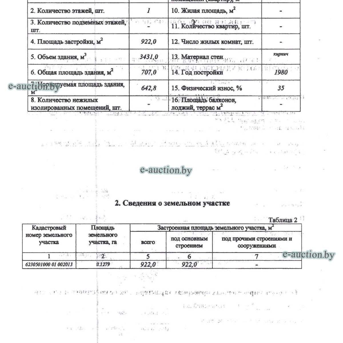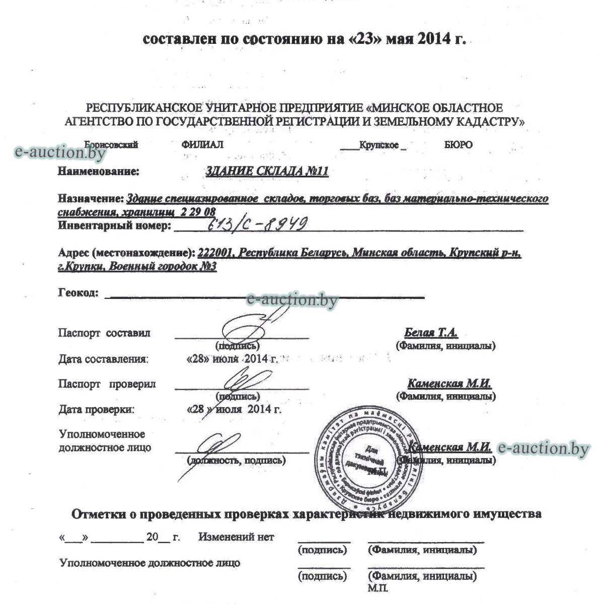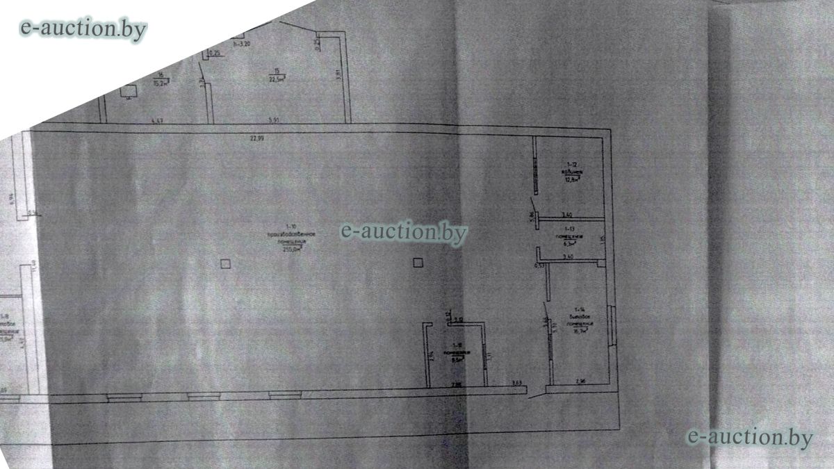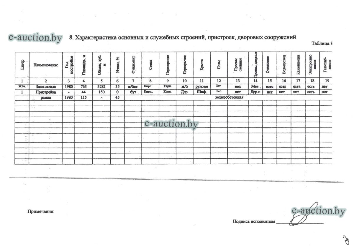 Сведения о капитальном строении из ЕГРНИ: Наименование: здание склада № 11; Назначение: здание специализированное складов, торговых баз, баз материально-технического снабжения, хранилищ; Составные части и принадлежности: одноэтажное кирпичное здание склада № 11 - Ж 1/к, пристройка - 1, рампа. Право хозяйственного ведения. Расположено на земельном участке с кад. № 623050100001002013 площадью 0.1279 га (право постоянного пользования). Минским областным исполнительным комитетом в целях упорядочения дальнейшего использования объектов недвижимости, реализуемых с аукционов (электронных торгов), принято решение от 15.11.2023 № 1119. В соответствии с решением необходимо обеспечить для случаев реализации объектов недвижимости, а именно: капитальные строения (здание, сооружения), незавершенные законсервированные и незаконсервированные капитальные строения, находящиеся в собственности Минской области, собственности ее административно-территориальных единиц, собственности хозяйственных обществ (товариществ), в уставных фондах которых более 50 процентов акций (долей) находятся в собственности Минской области и (или) ее административно-территориальных единиц, с аукционов (электронных торгов) в исполнительном производстве обязательными следующие условия: - обеспечение безопасности и ограничение доступа на недвижимое имущество с даты подписания акта о приемке-передаче; - использование земельного участка и объекта недвижимости в соответствии с назначением, определенным райгорисполкомами; - поддержание надлежащего санитарного, технического состояния объекта недвижимости и земельного участка; - срок начала и период проведения реконструкции объектов недвижимости (при необходимости ее проведения) и (или) возведения недвижимого имущества после сноса приобретенного объекта недвижимости либо сноса отдельных объектов, входящих в состав приобретенного объекта недвижимости, которые не могут быть использованы; - срок завершения строительства незавершенных законсервированных и незаконсервированных капитальных строений. |