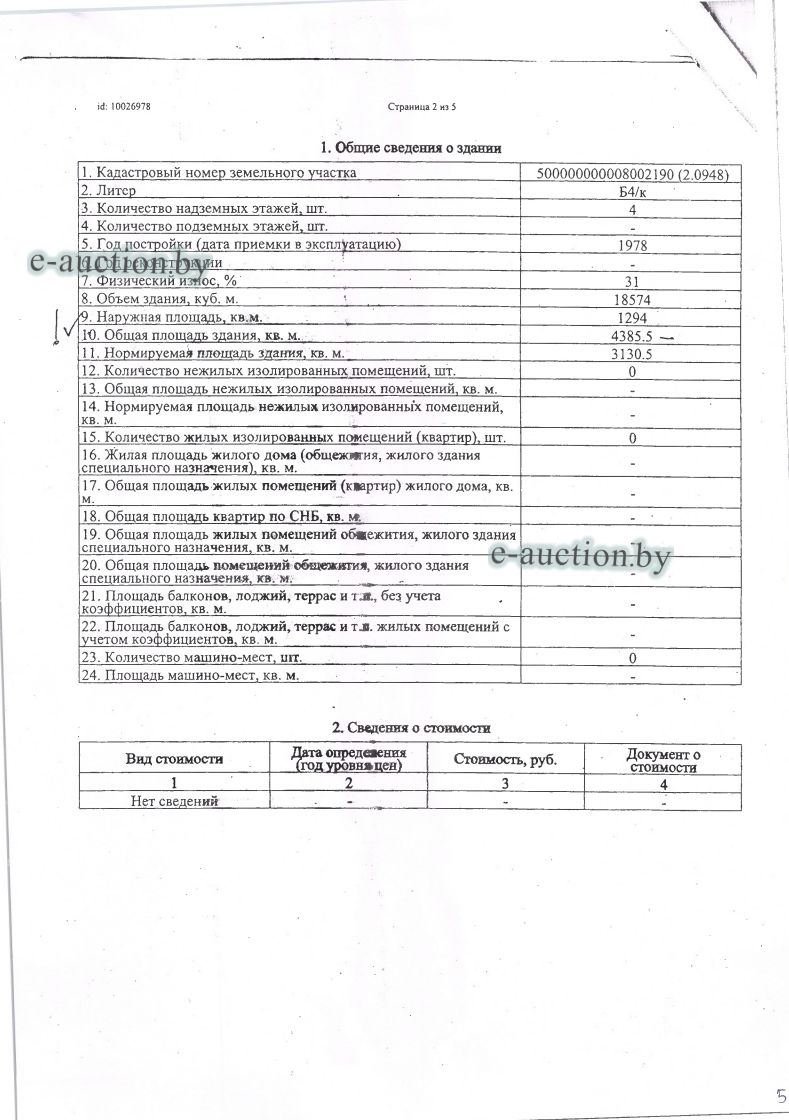 Сведения о капитальном строении из ЕГРНИ: Общая площадь (протяженность): 4407; Наименование: Административно-производственный корпус; Назначение: Здание нежилое; Составные части и принадлежности: сведения отсутствуют; Принадлежит должнику на праве собственности. Кадастровый номер земельного участка, на котором расположено капитальное строение: 500000000008002190, площадью 1.8995 га (Право постоянного пользования); Целевое назначение земельного участка: Эксплуатация административного и производственных зданий и сооружений; Назначение земельного участка в соответствии с единой классификацией назначения объектов недвижимого имущества: Земельный участок для размещения объектов административного и (или) административно-торгового назначения. Отдельный земельный участок для обслуживания капитального строения не выделен. *Согласно ведомости технических характеристик, общая площадь здания составляет 4385,5 кв.м. |