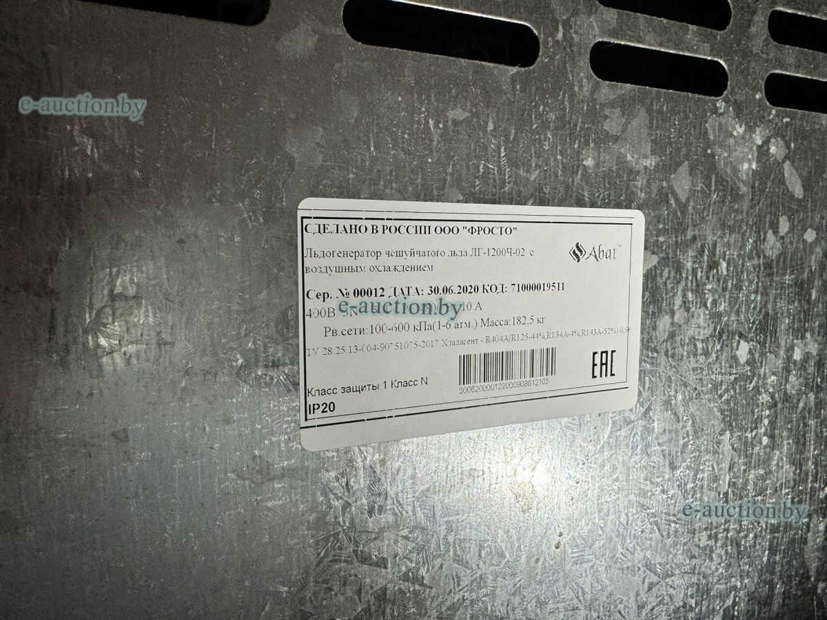Льдогенератор чешуйчатого льда ЛГ-1200Ч-02, заводской № 00012, год выпуска - 2021. |