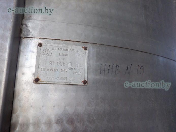 Танк вертикальный из нержавеющей стали с рубашкой охлаждения, мешалкой. Объем 4 м³. Я1-ОСВ-4, инвентарный номер 10. |