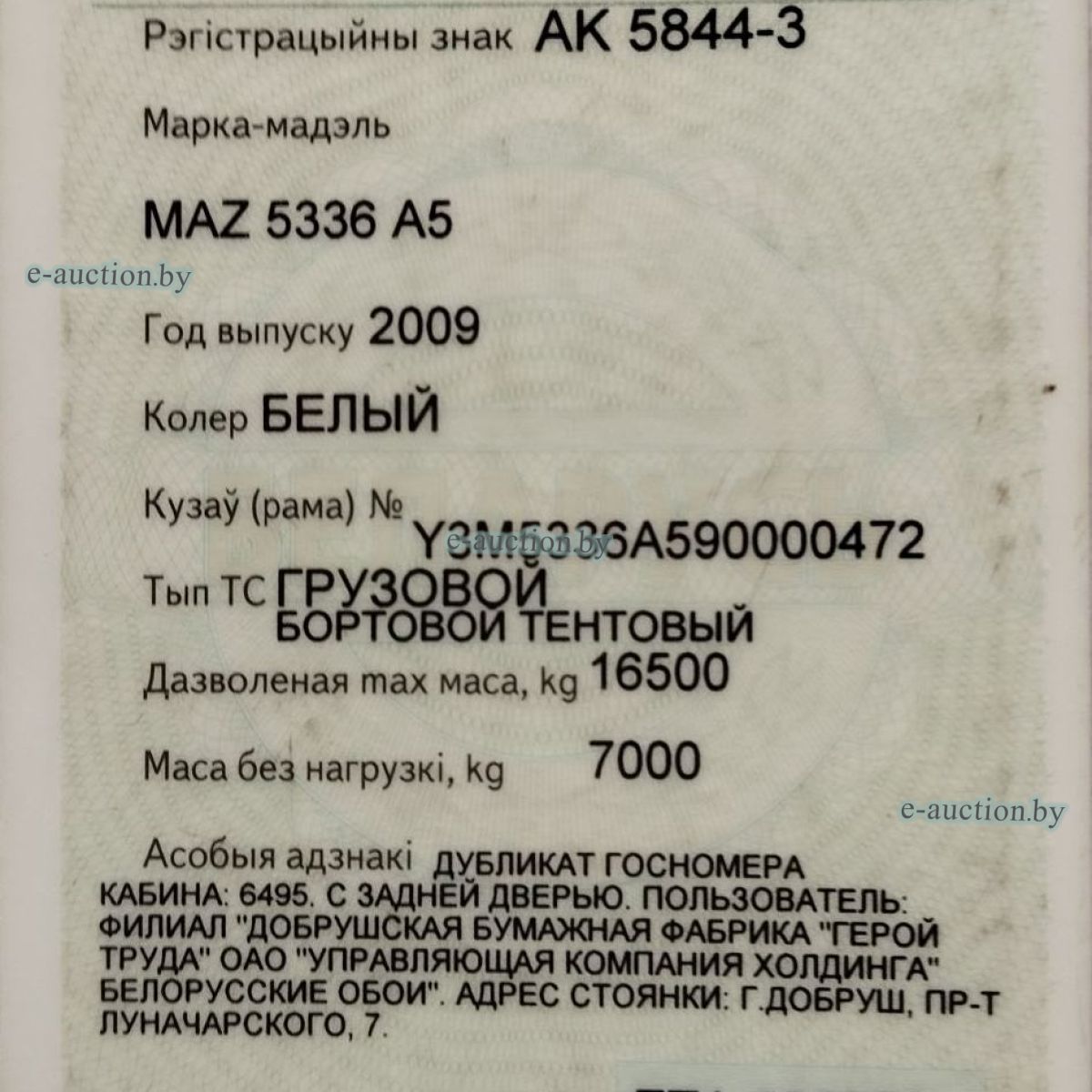 Рег. знак АК 5844-3 VIN: Y3M5336A5590000472 Начальная стоимость с НДС. |