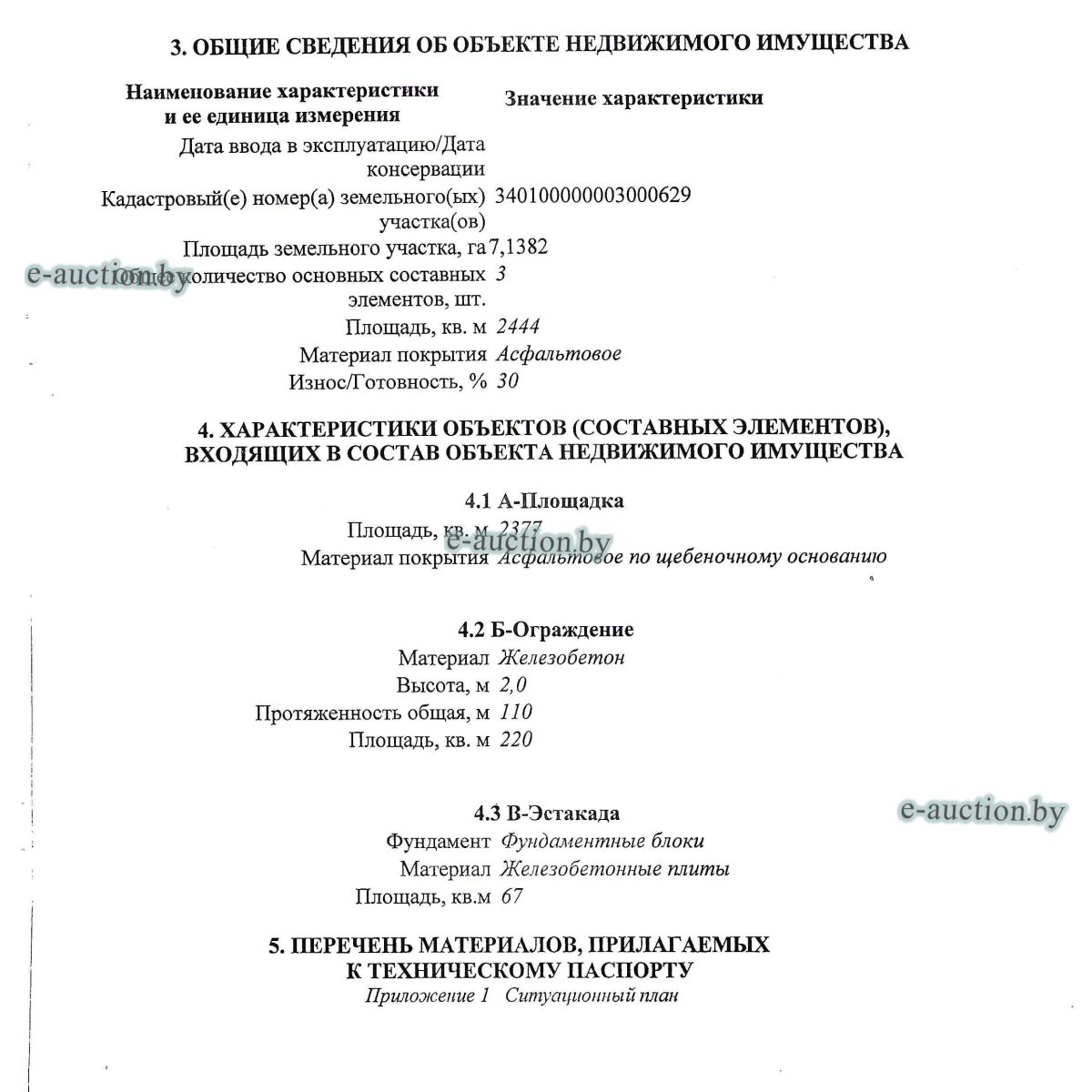 Сведения о капитальном строении: Наименование: Сооружение специализированное автомобильного транспорта и автодорожного хозяйства (Автодром) Назначение: Сооружение специализированное автомобильного транспорта и автодорожного хозяйства Составные части и принадлежности: площадка, ограждение, эстакада Сведения о земельном участке: Кадастровый номер земельного участка, на котором расположено капитальное строение: 340100000003002792 площадью 0.2642 га (право постоянного пользования) Целевое назначение земельного участка: для эксплуатации и обслуживания сооружения специализированного автомобильного транспорта и автодорожного хозяйства (Автодром) Назначение земельного участка в соответствии с единой классификацией назначения объектов недвижимого имущества: Земельный участок для размещения объектов неустановленного назначения |