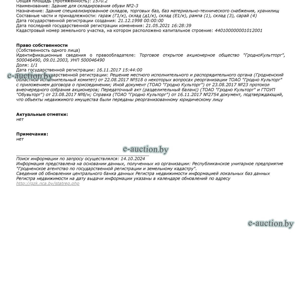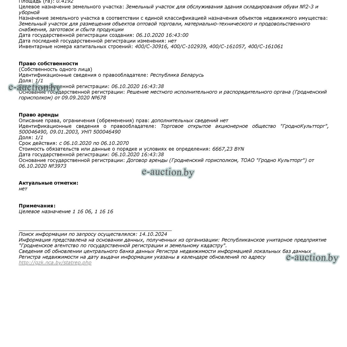 Сведения о капитальных строениях из ЕГРНИ: Инвентарный номер: 400/C-30916. Адрес (местоположение): Гродненская обл., г. Гродно, ул. Соколовского, 20К. Общая площадь (протяженность): 1570,2 Наименование: здание для складирования обуви №2-3. Назначение: здание специализированное складов, торговых баз, баз материально-технического снабжения, хранилищ. Составные части и принадлежности: гараж (Г1/к), склад (д1/к), склад (Е1/к), рампа (1), склад (3), сарай (4). Инвентарный номер: 400/C-102939 Адрес (местоположение): Гродненская обл., г. Гродно, ул. Соколовского, 20К/1. Общая площадь (протяженность): 9,8 Наименование: уборная. Назначение: здание специализированное для бытового обслуживания населения. Составные части и принадлежности: сведения отсутствуют. Инвентарный номер: 400/C-161061. Адрес (местоположение): Гродненская обл., г. Гродно, ул. Соколовского, 20К, благоустройство территории. Общая площадь (протяженность): 608,8 Наименование: благоустройство. Назначение: сооружение неустановленного назначения. Составные части и принадлежности: покрытие асфальтобетонное А, бордюр а1, подпорная стенка Б, площадка ТБО В, ограждение площадки ТБО. Инвентарный номер: 400/C-161057 Адрес (местоположение): Гродненская обл., г. Гродно, ул. Соколовского, 20К, ограждение территории Общая площадь (протяженность): 122,1 Наименование: ограждение территории. Назначение: сооружение неустановленного назначения. Составные части и принадлежности: ограждение металлическое г1, ограждение металлическое г2, ворота металлические г3, ворота металлические г4, ворота металлические г5, ворота металлические г6, ограждение из железобетонных плит г7, ограждение деревянное г8, ворота металлические г9. Право собственности (собственность одного лица). Расположены на земельном участке с кадастровым № 440100000001012001 площадью 0.4192 га (право аренды по 06.10.2070). В соответствии с градостроительным проектом общего планирования «Генеральный план г. Гродно» земельный участок расположен на территории, предусмотренной под коммунально-обслуживающую и коммунально-складскую зоны. При переходе права собственности на капитальные строения и права аренды на земельные участки возможно использование новыми собственниками указанных строений для размещения административно-производственных, коммунально-складских и коммунально-обслуживающих объектов, объектов сопутствующего обслуживания. Пожарно-охранная сигнализация (в задании складирования обуви №2-3, инв. № 400/С-30916). Запорная пожарная арматура (в задании складирования обуви №2-3, инв. № 400/С-30916). Часть реализуемого имущества предоставляется в аренду: часть капитального строения с инвентарным номером 400/С-30916 площадью 41,8 кв.м., срок аренды по договору по 05.02.2026; часть капитального строения с инвентарным номером 400/С-30916 площадью 217,7 кв.м., срок аренды по договору по 30.11.2025; часть капитального строения с инвентарным номером 400/С-161061 площадью 8,25 кв.м., срок аренды по договору по 31.07.2025; Цена указана с НДС. Условия оплаты предмета торгов: Оплата с рассрочкой платежа на 24 (двадцать четыре) месяца со дня заключения договора купли-продажи, с ежемесячной индексацией платежей и первоначальным платежом в течение одного месяца с момента заключения договора купли-продажи в размере 30 % от цены продажи. |