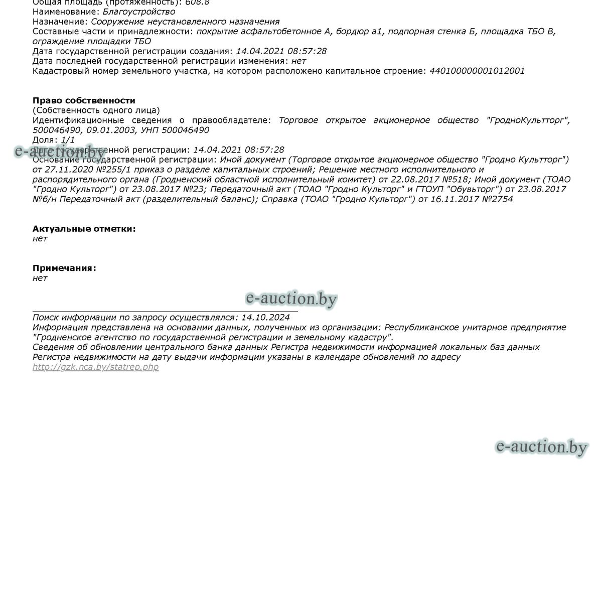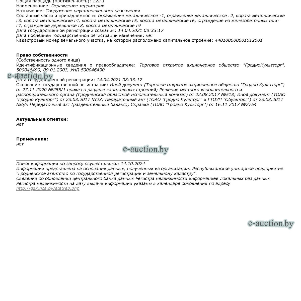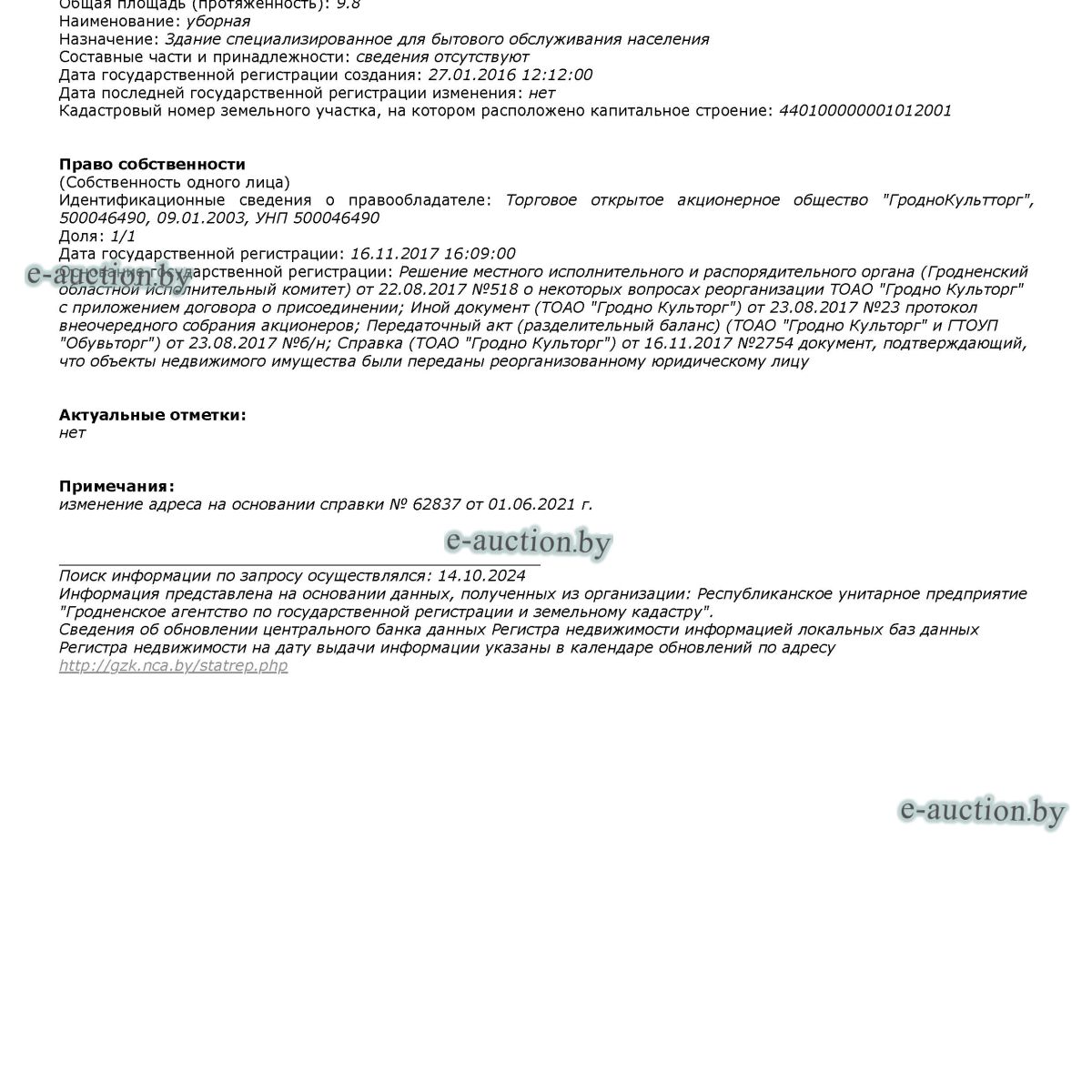 | Адрес организатора аукциона | 230012, г. Гродно ул. Пушкина, 37А |