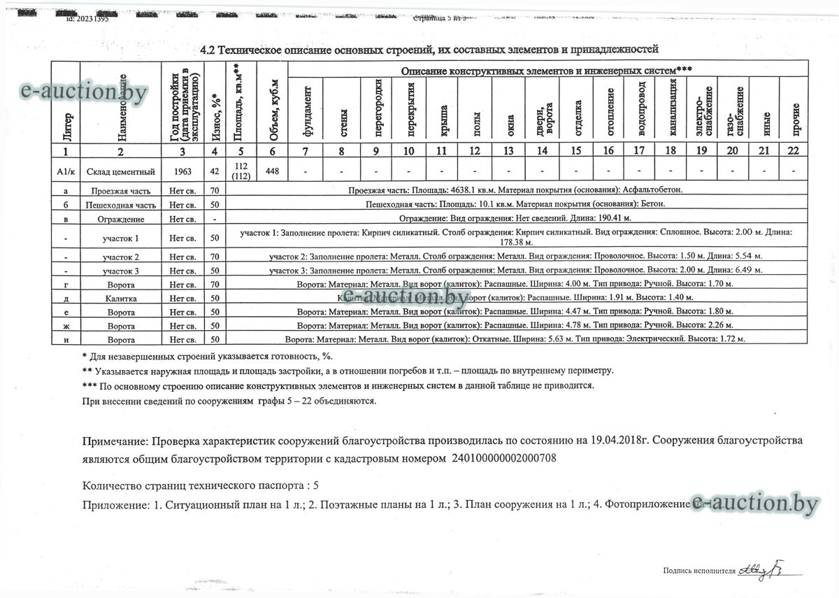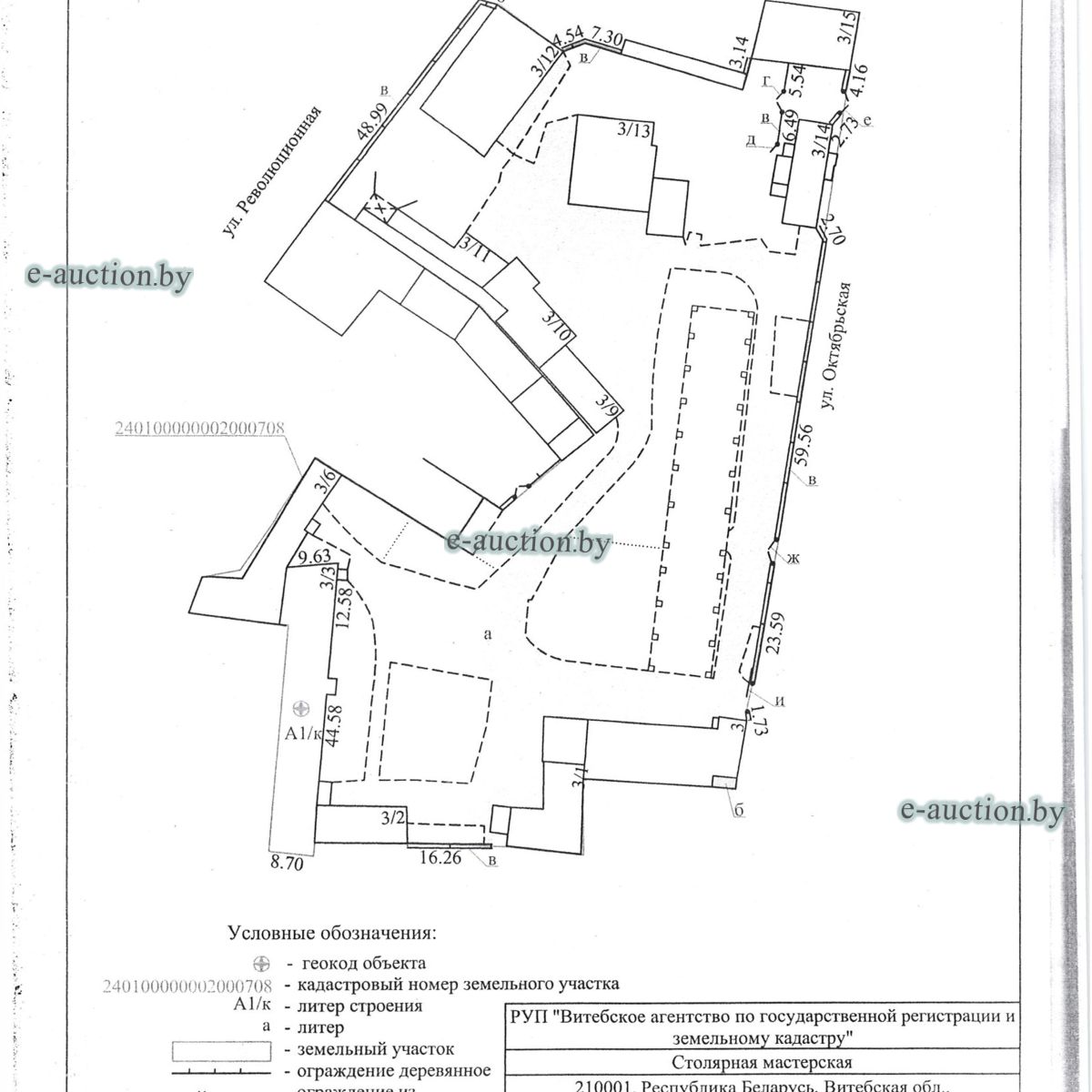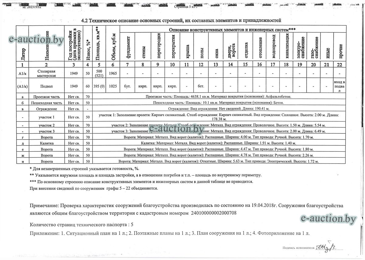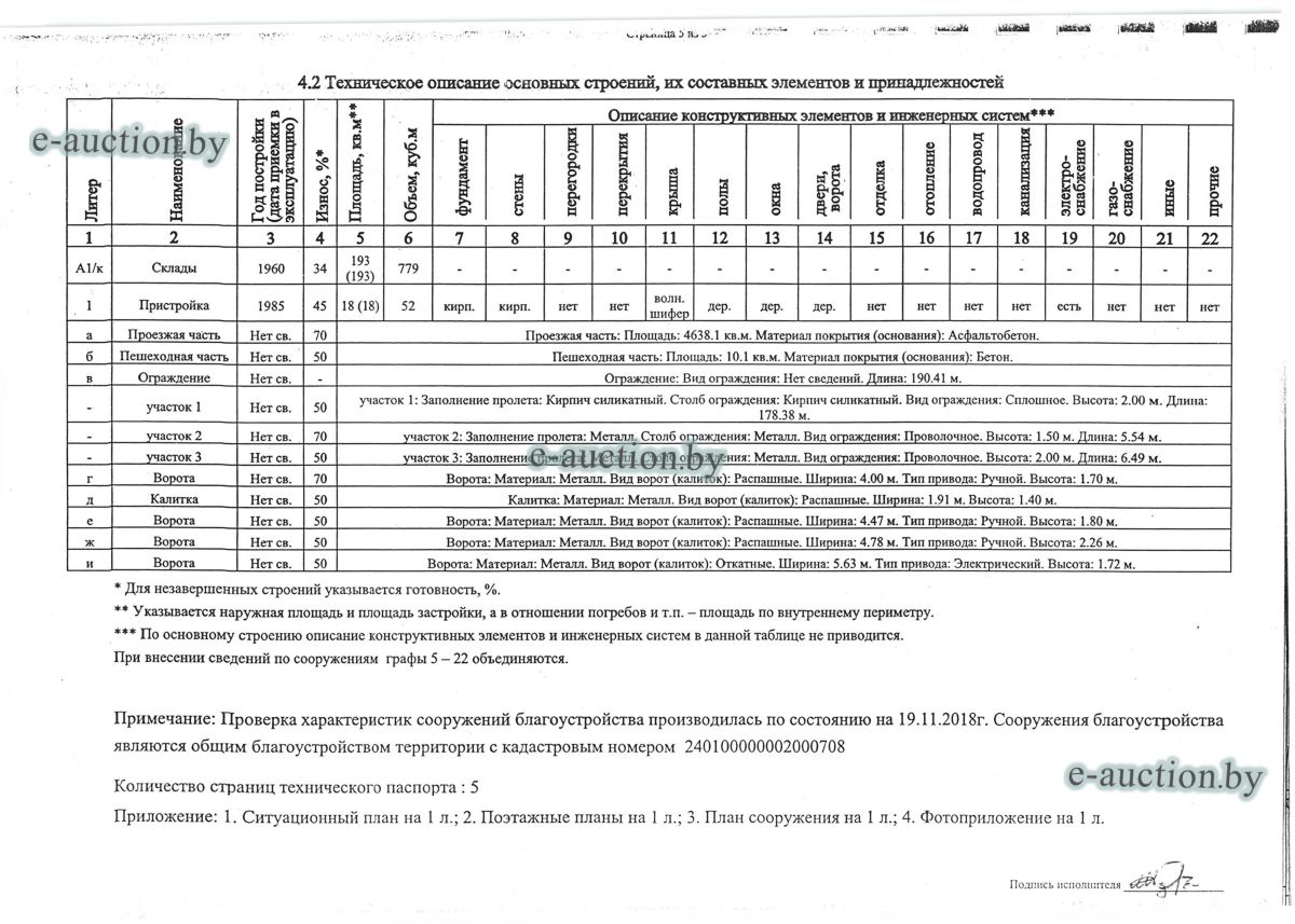 Комплекс недвижимого имущества с правом аренды земельного участка в г. Витебске и многолетним насаждением: 1. Сведения о капитальном строении: Инвентарный номер: 200/C-54443 Адрес (местоположение): Витебская обл., г. Витебск, ул. Октябрьская, 3 Общая площадь (протяженность): 322.6 Наименование: административный корпус Назначение: Здание административно-хозяйственное Составные части и принадлежности: пристройка, проезжая часть, пешеходная часть, ограждение: участок 1, участок 2, участок 3, четверо ворот, калитка 2. Сведения о капитальном строении: Инвентарный номер: 200/C-54455 Адрес (местоположение): Витебская обл., г. Витебск, ул. Октябрьская, 3/3 Общая площадь (протяженность): 714.6 Наименование: Столярная мастерская Назначение: Здание неустановленного назначения Составные части и принадлежности: Подвал, проезжая часть, пешеходная часть, ограждение: участок 1, участок 2, участок 3, калитка, четверо ворот Примечания: Кирпичное здание столярной мастерской 3. Сведения о капитальном строении: Инвентарный номер: 200/C-54444 Адрес (местоположение): Витебская обл., г. Витебск, ул. Октябрьская, 3/ 6 Общая площадь (протяженность): 259.4 Наименование: склады Назначение: Здание специализированное складов, торговых баз, баз материально-технического снабжения, хранилищ Составные части и принадлежности: щитовая, проезжая часть, пешеходная часть, ограждение: участок 1, участок 2, участок 3, четверо ворот, калитка Примечания: одноэтажное кирпичное здание складов с щитовой. 4. Сведения о капитальном строении: Инвентарный номер: 200/C-54441 Адрес (местоположение): Витебская обл., г. Витебск, ул. Октябрьская, 3/1 Общая площадь (протяженность): 173.2 Наименование: Склады Назначение: Здание специализированное складов, торговых баз, баз материально-технического снабжения, хранилищ Составные части и принадлежности: Пристройка, проезжая часть, пешеходная часть, ограждение: участок 1, участок 2, участок 3, калитка, четверо ворот Примечания: Одноэтажное кирпичное здание складов. 5. Сведения о капитальном строении: Инвентарный номер: 200/C-54446 Адрес (местоположение): Витебская обл., г. Витебск, ул. Октябрьская, 3/ 9 Общая площадь (протяженность): 94.1 Наименование: склад цементный Назначение: Здание специализированное складов, торговых баз, баз материально-технического снабжения, хранилищ Составные части и принадлежности: проезжая часть, пешеходная часть, ограждение: участок 1, участок 2, участок 3, четверо ворот, калитка Примечания: одноэтажное кирпичное здание цементного склада. 6. Сведения о капитальном строении: Инвентарный номер: 200/C-54447 Адрес (местоположение): Витебская обл., г. Витебск, ул. Октябрьская, 3/ 12 Общая площадь (протяженность): 336.4 Наименование: гаражи Назначение: Здание специализированное для ремонта и (или) технического обслуживания автомобилей (в том числе автомобильные заправочные, зарядные и газонаполнительные станции) Составные части и принадлежности: проезжая часть, пешеходная часть, ограждение: участок 1, участок 2, участок 3, четверо ворот, калитка Примечания: одноэтажное кирпичное здание гаражей. 7. Сведения о капитальном строении: Инвентарный номер: 200/C-54448 Адрес (местоположение): Витебская обл., г. Витебск, ул. Октябрьская, 3/ 2 Общая площадь (протяженность): 105.1 Наименование: здание мастерской столярной Назначение: Здание неустановленного назначения Составные части и принадлежности: проезжа